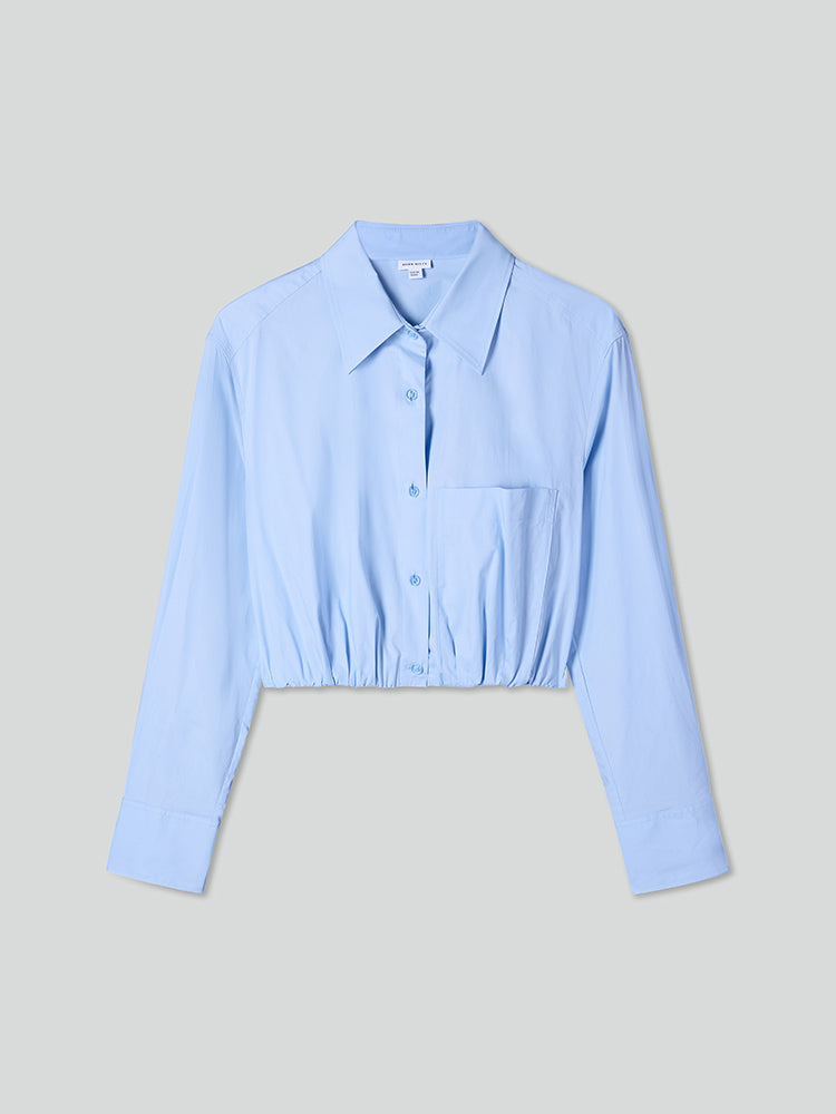 Selected stretch cotton shirt fabric offers a soft cotton touch and comfortable wear. It combines good drape with firmness, featuring a smooth surface. The inclusion of elastic fibers provides a snug fit, effectively enhancing body lines. The classic shirt collar is adorned with ice blue buttons, adding delicate details that highlight the brand's value. The short hem cut and gathered waist design outline the waistline, revealing a bold and edgy personality. Adjustable two-button cuffs provide a flexible fit, adding a sense of tailored sharpness.