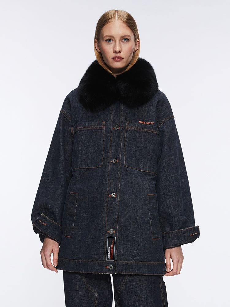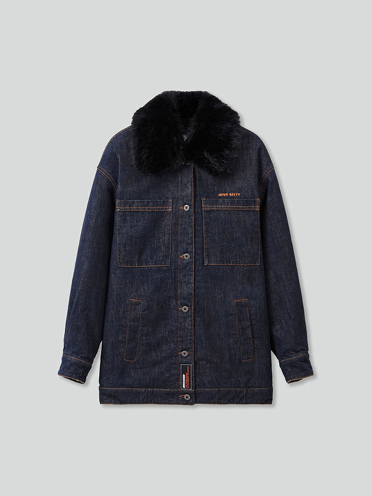 Crafted from natural denim fabric, this piece innovatively breaks through traditional denim styles. The fabric boasts an original and natural color, with a rugged style and clear texture that embodies both the classic toughness of traditional denim and the comfort of modern styles. The body features a cozy lamb wool-style lining, while the sleeves incorporate a padded design for a perfect blend of warmth and style. The shirt collar design includes hidden buttons for layering with a faux fur collar, offering both warmth and fashionable appeal. Delicate logo embroidery adds a striking touch with contrasting colors, enhancing the overall detail. The single-button front closure is decorated with silicone patches to add a unique and novel highlight.