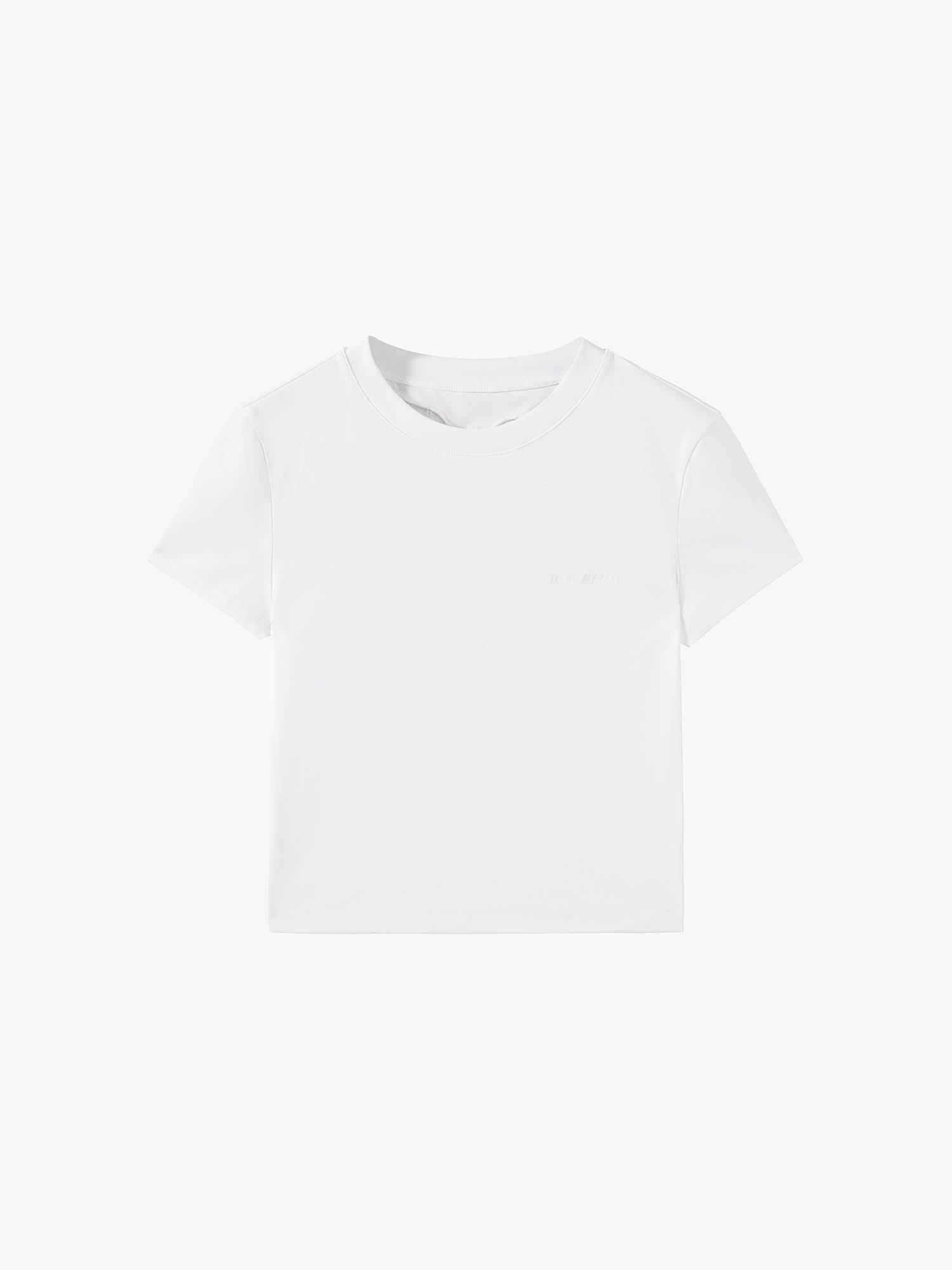 The T-shirt features a regular shoulder cut and a crew neckline, with wing details on the back adding a playful and whimsical touch. Made from stretch ribbed knit fabric, it offers a soft, flexible fit that is comfortable and form-fitting without feeling tight.