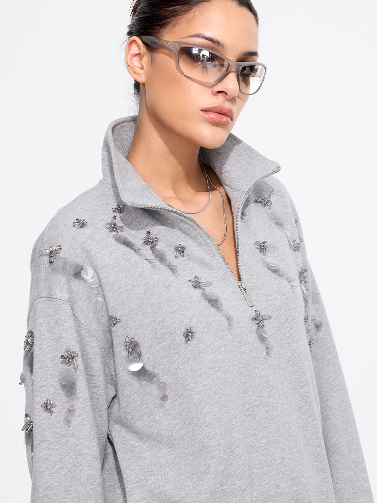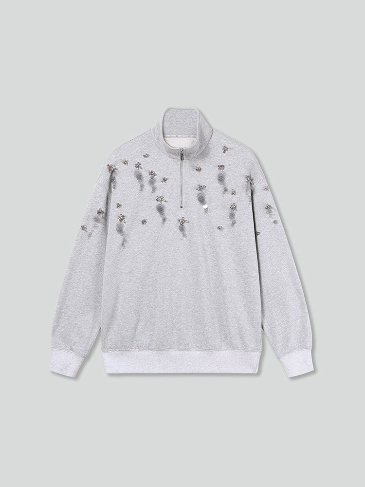 Crafted from a cotton-blend yarn with a brushed finish, this fabric feels warm against the skin. It features a tight and delicate texture, enhanced by a napped treatment that provides a comfortable cotton sensation and a structured silhouette, while blended fine glitter particles capture attention effortlessly. The sharp stand collar, combined with a half-zip design at the front, adds a touch of cool sophistication. The cuffs are finished with fine ribbed stitching, gently shaping and hugging the wrists. The loose silhouette is cinched at the hem with contrasting ribbed detailing, creating a visually appealing layered effect.