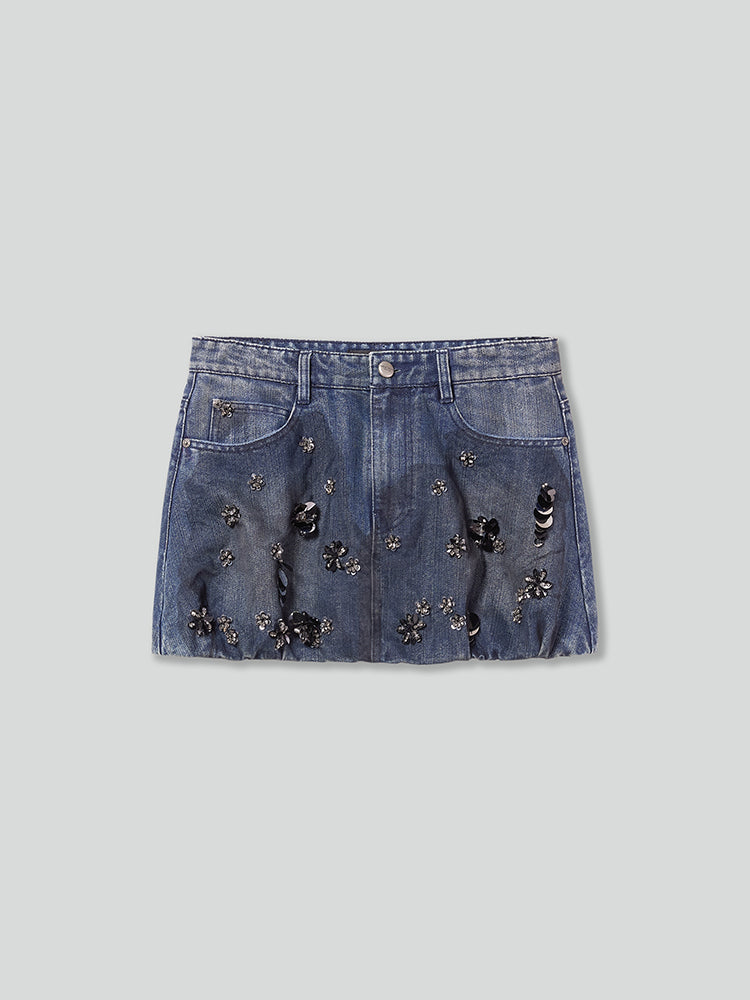 The fabric is dyed using an indigo dyeing technique, and after processes like enzymatic wash, snowflake wash technique, and stain rubbing, it maintains its vibrant color. The fabric yarns are a mix of different lengths of slub yarn, giving it a vintage style. The weft yarn features a silver-glossed thread, which, after washing, creates a retro and eye-catching effect when paired with the indigo warp. The comfortable, natural waistline is accentuated with custom brand buttons, elevating the vintage feel. The coin pocket is adorned with beaded details, adding a sparkling touch and enhancing the unique outfit. A deep brown embossed leather label complements the distressed washed denim, creating a harmonious, retro aesthetic.