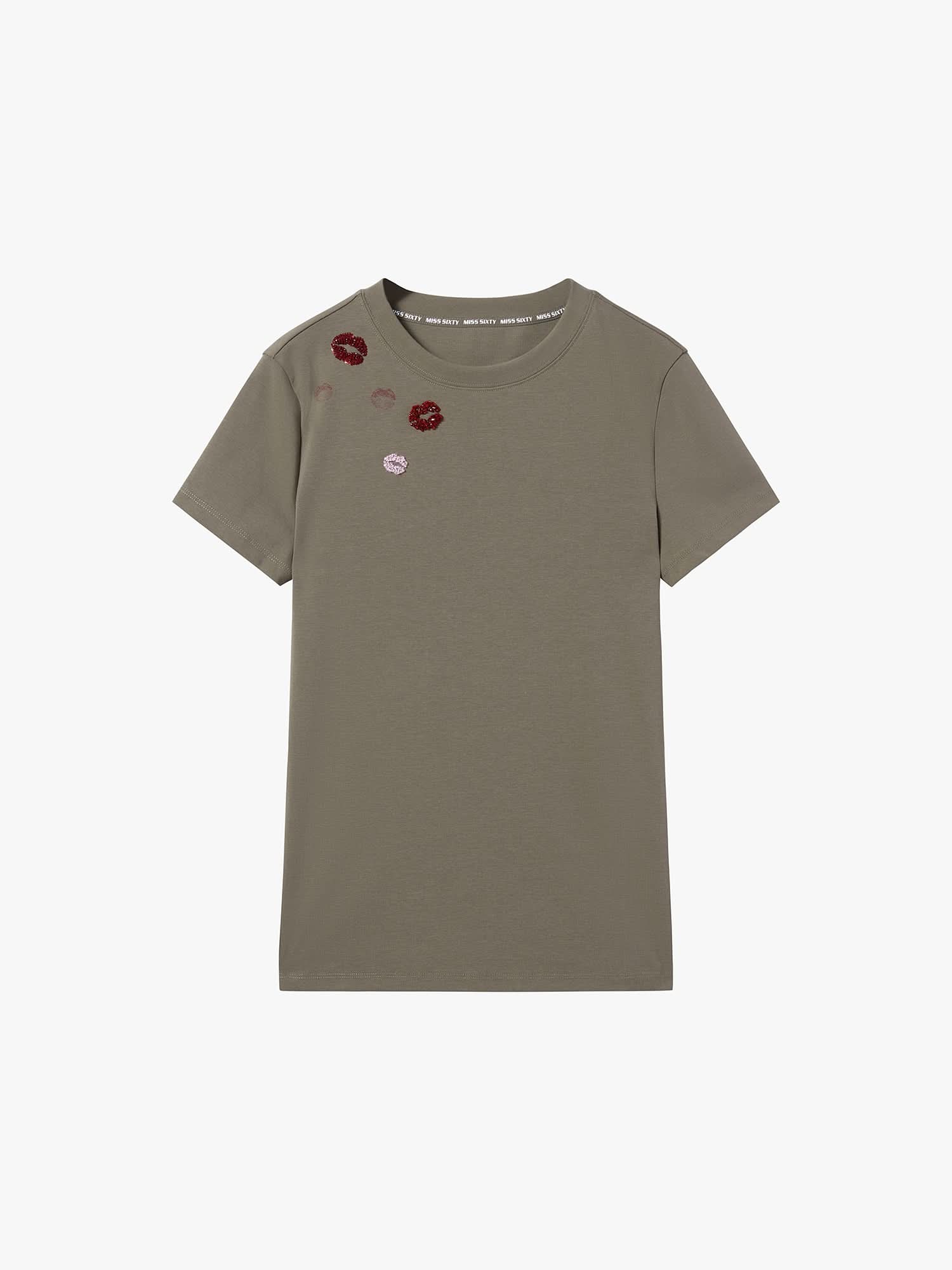 The T-shirt features a round neckline design with a simple and neat silhouette. Multi-colored bead-embroidered lip prints embellish the garment, highlighting its unique charm. Made from knit fabric with a tailored fit, it offers comfort and stretch, with a smooth and delicate texture, providing a comfortable and relaxed wearing experience.