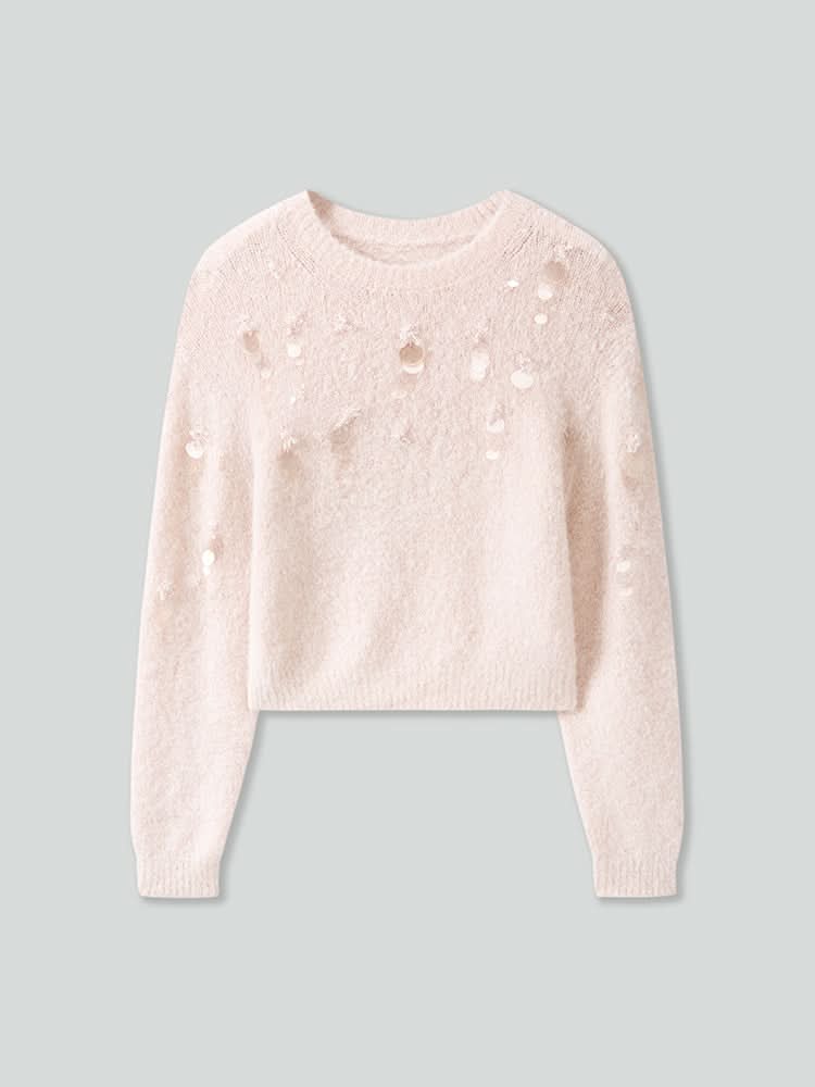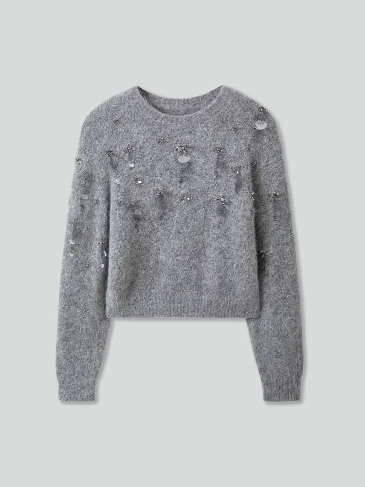 This garment is crafted from a premium Italian blended yarn, featuring Suri alpaca wool known for its delicate fibers and soft feel. The combination with Merino wool ensures the yarn remains light while providing excellent comfort and warmth. The yarn is processed with a brushing technique, creating a fine layer of long fibers on the surface, giving the fabric a unique appearance and texture, with a plush, soft feel. The ribbed crew neck design offers a simple and comfortable wearing experience. The ribbed hem design gently cinches the silhouette, adding a touch of fashionable flair. The elastic ribbed cuffs create a sharp, clean look, accentuating the slender lines of the arms with a minimalist and elegant appeal.