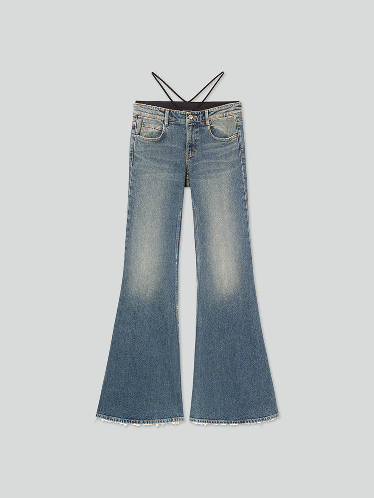 This piece utilizes a classic vintage dyeing method, undergoing multiple washing techniques such as enzymatic washing, front whiskering, and distressing, resulting in a rich and varied color palette that showcases a unique retro style for each garment. The high cotton content provides a soft and skin-friendly feel, while the low-stretch twill fabric ensures excellent comfort and flexibility. The eye-catching bikini-style waistband redefines the denim's visual appeal, blending fashion with a hint of sexiness. A distressed leather label complements the vintage color tone of the denim, adding depth to the design on the back waistband. The retro flared silhouette features distressed details, creating a distinctive look for each piece.
