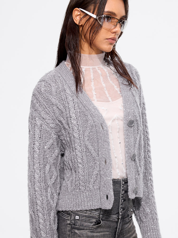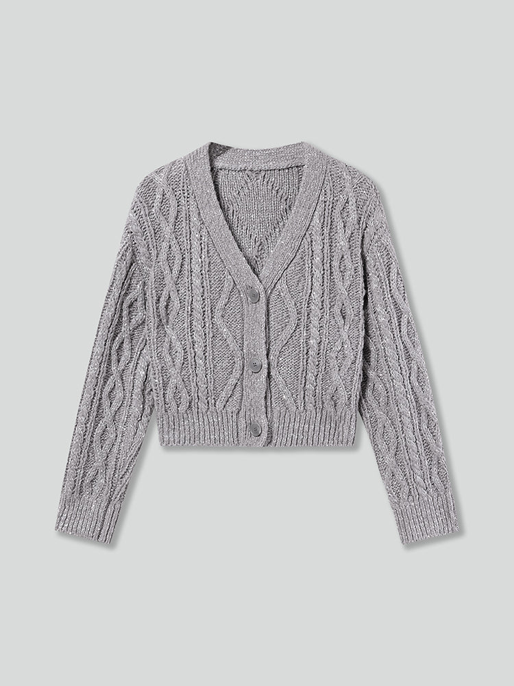 Made from selected Italian yarns and domestic sequin yarns, this high-quality wool and nylon blend, combined with Italian air-spun yarn technology, gives the fabric a soft and comfortable feel. The sequin yarn is made with recycled polyester filaments and multicolored sequins, spun through skilled crochet techniques, creating a smooth and sparkling yarn with a firm and sculpted fit, presenting a high-quality finish. The elegant V-neck design with a wide edge adds a sophisticated touch, providing both a stylish and comfortable fit. The relaxed dropped shoulder sleeves enhance the French flair, while the ribbed cuffs add a neat and tailored look. The hem is finished with ribbed detailing, giving the garment a more structured and outstanding silhouette.