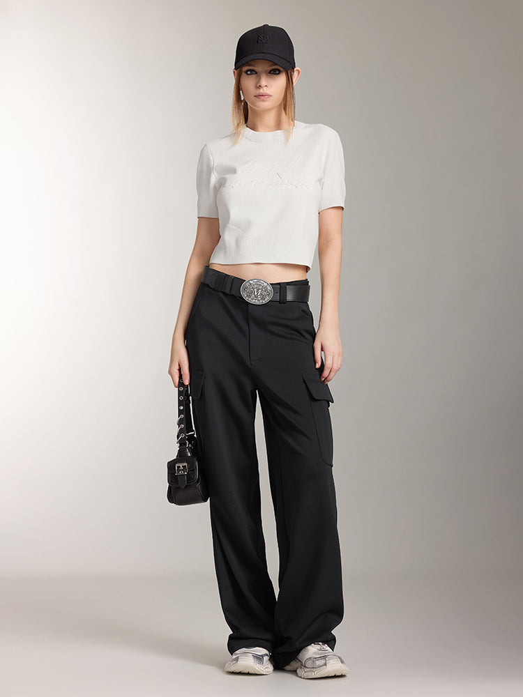 Acetate fiber, derived from wood pulp, gives the yarn a rich, lustrous sheen and a soft, comfortable touch with excellent drape. The blend of acetate, new-generation fibers, and spandex creates a lightweight, airy structure, resulting in breathable, structured garments. The high-waisted design shapes the waist, while adjustable side straps add visual interest and enhance vitality. Symmetrical flap pockets break up the monotony, creating a dimensional fashion sense and adding a touch of assertiveness. The cargo style pockets add depth and a powerful, dynamic look to the outfit.