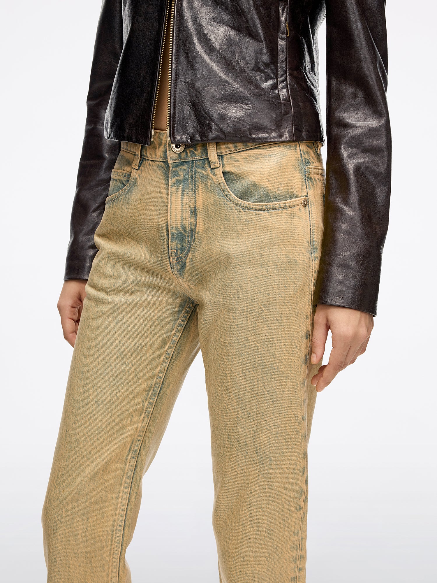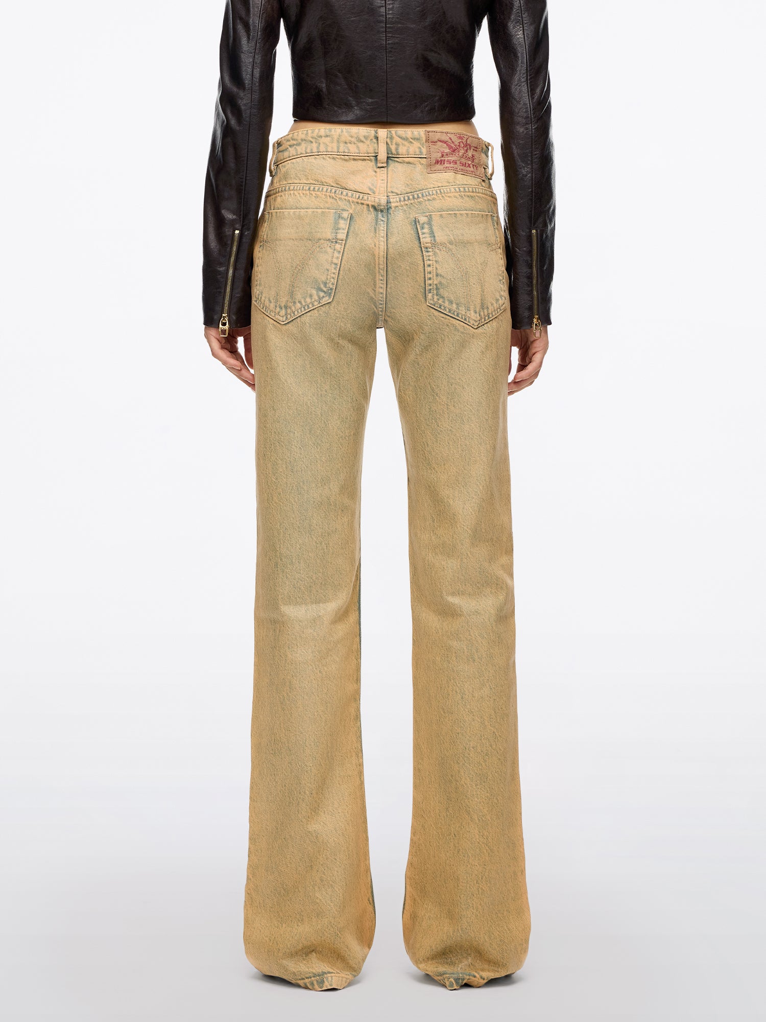 Effortless yet refined, the Black & Gold Collection Flared Denim Pants reimagine classic denim through a modern lens. The mid-rise, tailored fit flows seamlessly into a soft flare from the knee, shaping a fluid, confident silhouette. Crafted from cotton denim with an oil-wax coating, the piece reveals a supple texture and a luminous sheen. Through a multi-stage fading process, each pair carries its own gradient depth and vintage allure—no two are ever the same.