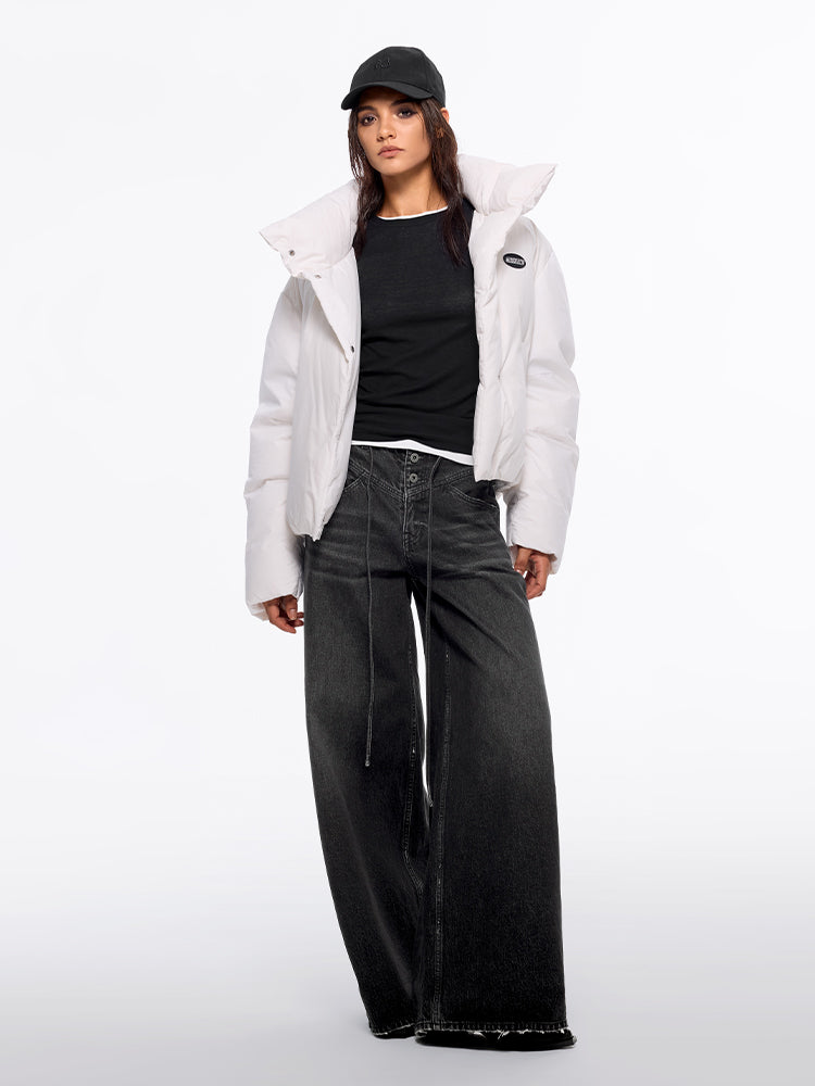 This product is made from coated cotton poplin, crafted using specialized textile techniques to create a distinctive slub texture. The rich feel of the fabric, combined with the lightweight coating, offers a functional style while retaining the softness of cotton, ensuring comfortable wear without overheating. The fashionable stand-up collar features a contrasting logo patch on the chest, adding a playful touch. The front closure uses a snap-button design for simplicity and ease of wear. The side pockets are both stylish and practical, while the drawstring detail at the hem gently shapes a warm, trendy silhouette.