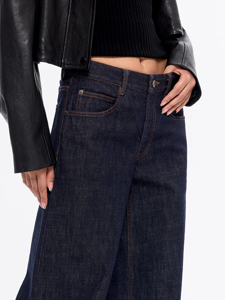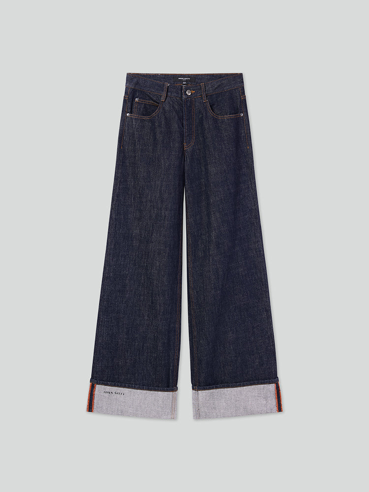 Crafted from premium active all-cotton denim, this fabric represents an innovative breakthrough in conventional denim. Its surface features an organic, natural hue and a coarse twill texture that enhances the tactile quality. Combining the vintage ruggedness of traditional denim with the comfort of modern styles, it’s finished with an active dyeing process that lends a structured silhouette for a bold, edgy look. Custom quality buttons complement the low-rise design, providing a comfortable fit that visually slims the waist. The distressed leather tag reflects the vintage natural color, embodying a sophisticated "old money" aesthetic. A monochromatic water-based logo is printed on the right pant leg, enhancing its retro feel, while the rolled hems double the style factor.