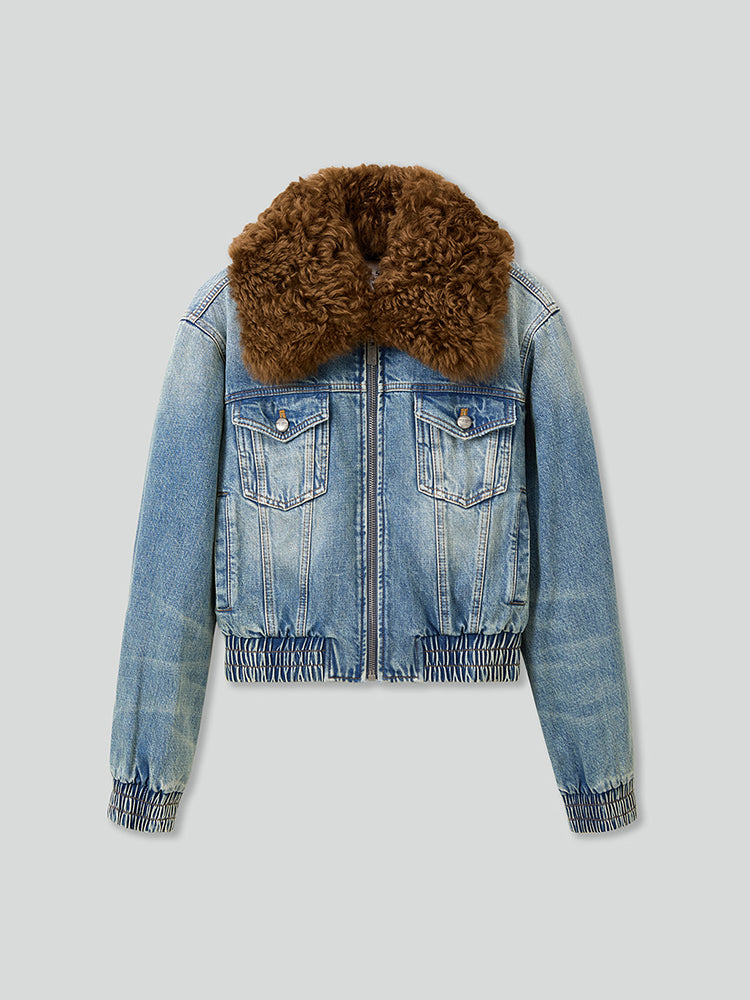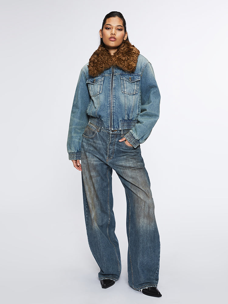 Crafted from 100% cotton denim, featuring a bamboo texture in both warp and weft, the fabric has clear patterns and a brushed finish on the underside, offering a delicate and soft feel for added warmth and comfort. The vintage wash effect creates a layered, harmonious retro color, resulting in unique visuals that are natural and unobtrusive. The shirt collar design includes hidden buttons for pairing with a wool collar for both warmth and style. The zippered front and elastic hem design easily shape a cool and carefree street style. The elastic cuffs gather the arm lines, and the edges are irregularly distressed, making each piece distinctive.