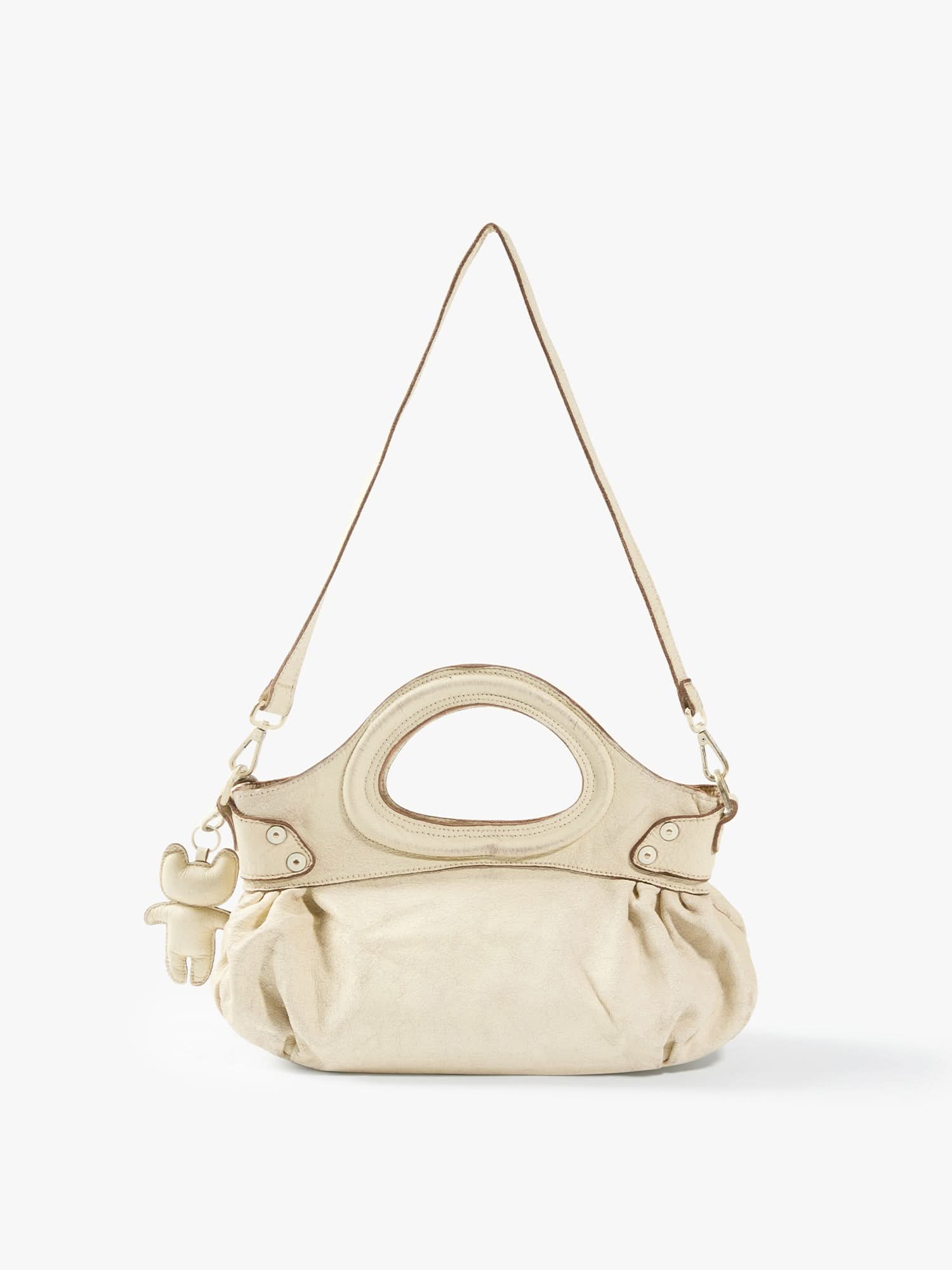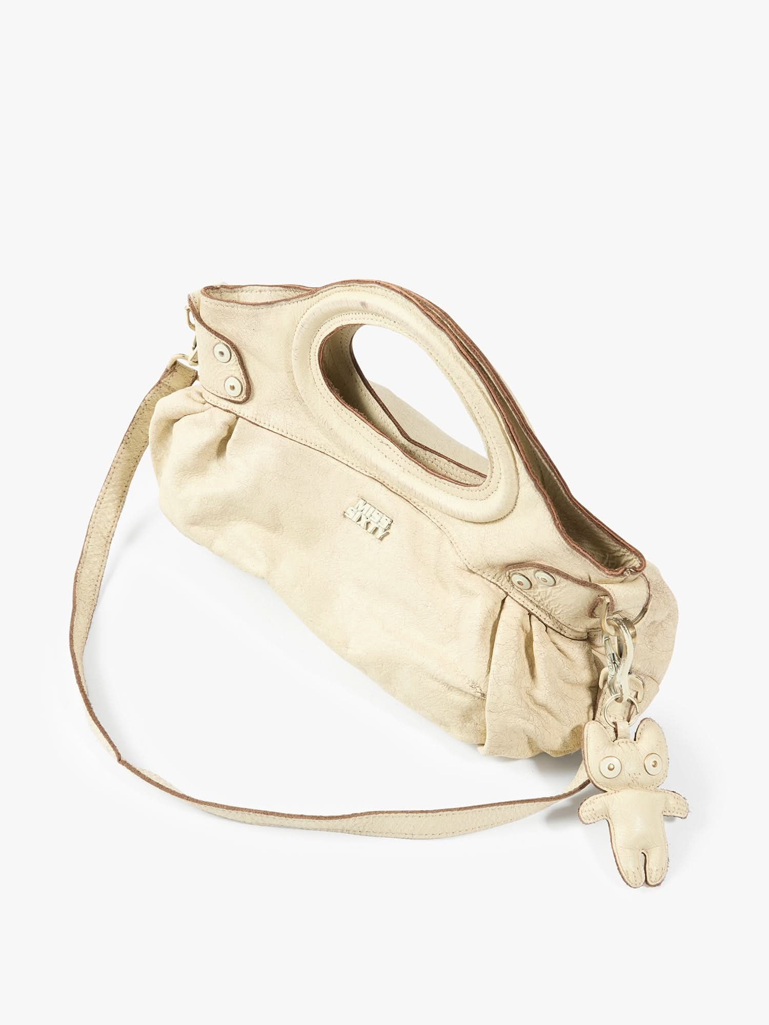 The MISS SIXTY × KNWLS collaboration features a bag with a unique cut, convertible for shoulder or hand carry, and accented with a metal logo on the front. Crafted from specially treated leather combined with nostalgic techniques, it showcases a distressed cracked effect, collectively embodying a futuristic aesthetic.