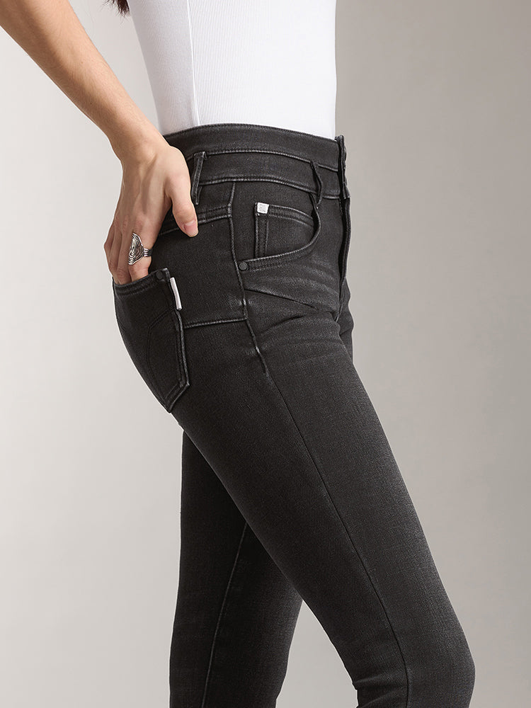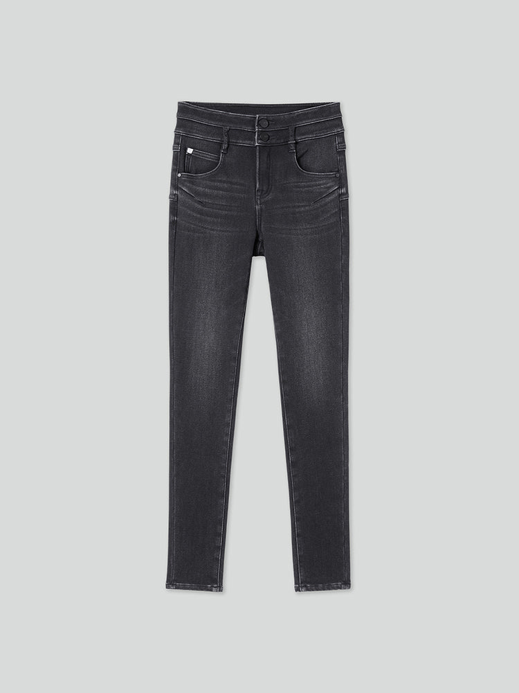 Made with a simplified blend of three types of cotton, paired with vulcanized black dyeing for a pure and natural color. The weft yarn uses double-core spandex, providing excellent elasticity and recovery. The inner layer is lined with soft, skin-friendly stretch fleece, perfectly combining softness with structure, offering warmth and a refined texture. The symmetrical double-button waistband design enhances the waistline, creating a more elongated and flattering silhouette. The black leather patch adds a cool touch, enhancing the brand's value. With a slim, tapered cut and a slightly stretchy fabric, it comfortably wraps the legs, accentuating sexy, long legs.