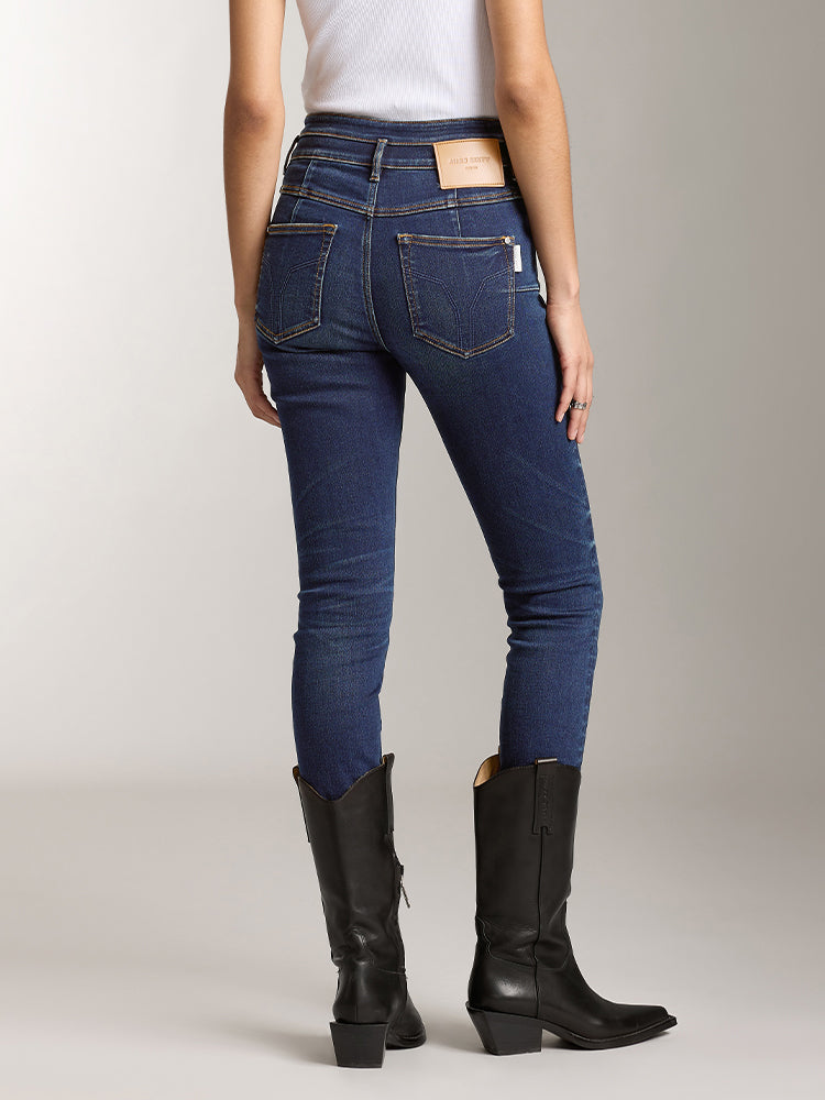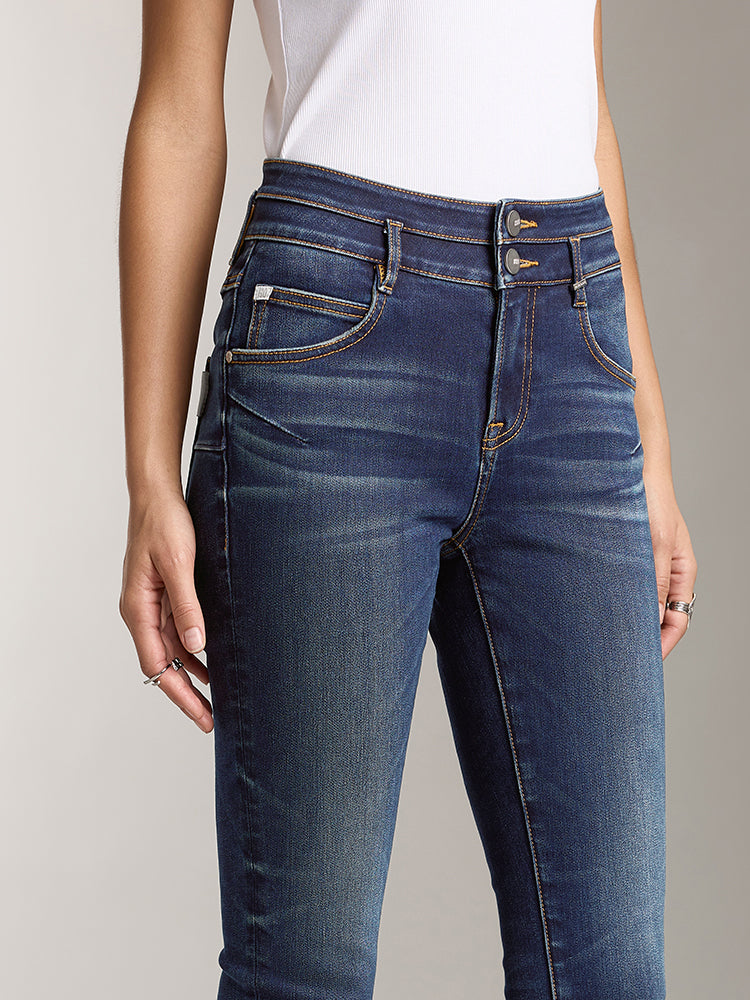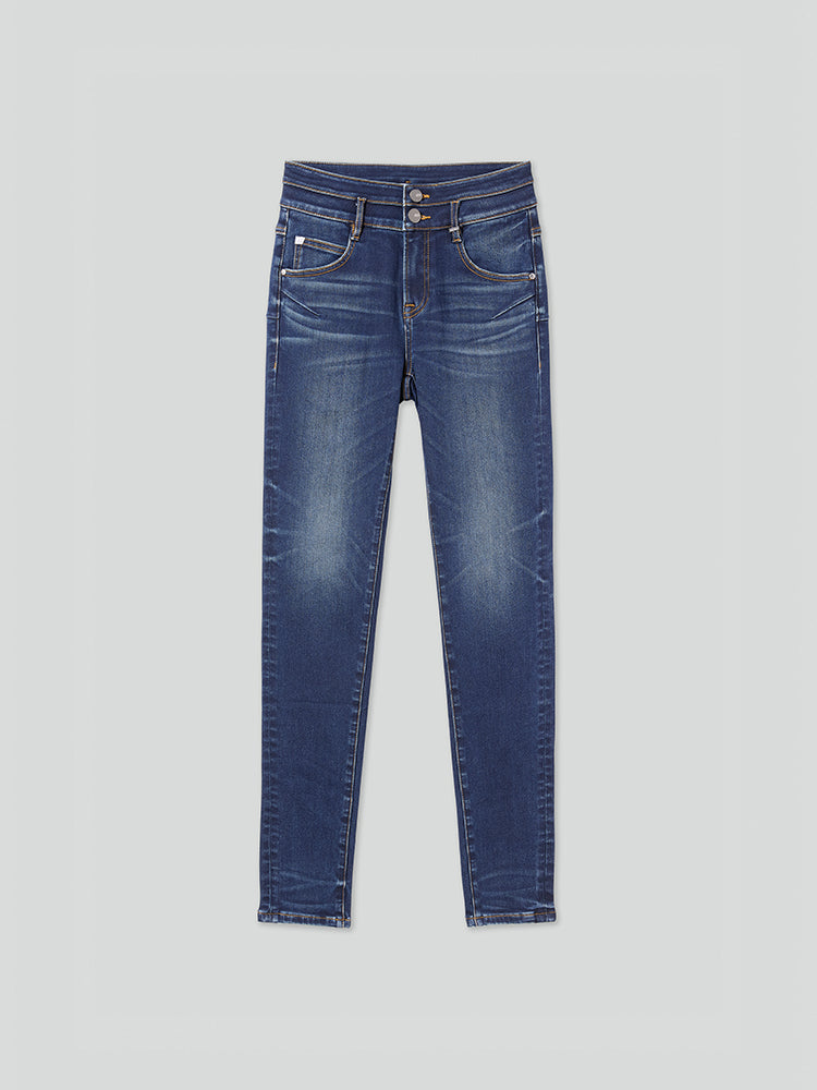Made from brushed denim fabric, this material is soft yet maintains its shape. Elastic fibers ensure a snug fit, while multiple washes create a layered, blended color effect. The brushed underside adds a soft, warm feel for enhanced comfort. The high-waisted double-button design raises the waistline, creating a more defined and flattering silhouette. A brown leather patch at the waist adds a touch of vintage charm, refreshing the overall look. The tapered cut wraps around the legs, accentuating a sleek and elongated silhouette.