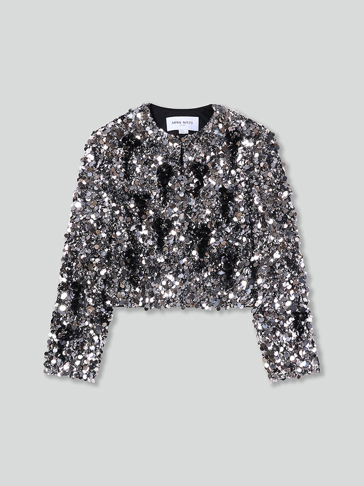Crafted with a specialized embroidery machine, the fabric features a densely embroidered base of black mesh adorned with overlapping black and silver sequins. The intricate, high-density sequin work delivers a dazzling yet affordable luxury. A sand-washed, vintage finish creates a worn effect, giving the black sequins a textured, mottled appearance that enhances the retro aesthetic. The fabric is soft and comfortable to the touch. The jacket showcases a minimalist round neckline, highlighting the neck's elegant lines for a refined look. The snap button placket adds a clean, tailored touch, while straight-cut sleeves and a lightly padded quilted lining provide warmth and structure, ensuring both style and functionality.