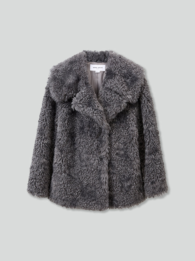 Crafted from selected faux shearling fabric, this piece features a unique jacquard style with a textured handfeel. The natural curl of the fabric enhances the garment's fashion versatility, offering a rich and substantial feel with a natural sheen that ensures comfort and warmth. This design exudes a luxurious, chic vibe, while the faux material is easier to care for than natural wool. The elegant wide lapel design elevates the overall style, showcasing a sophisticated silhouette. Custom tortoiseshell buttons add a touch of premium quality, enhancing the garment's overall value. The clean hemline emphasizes the shape, allowing for greater freedom of movement in styling.