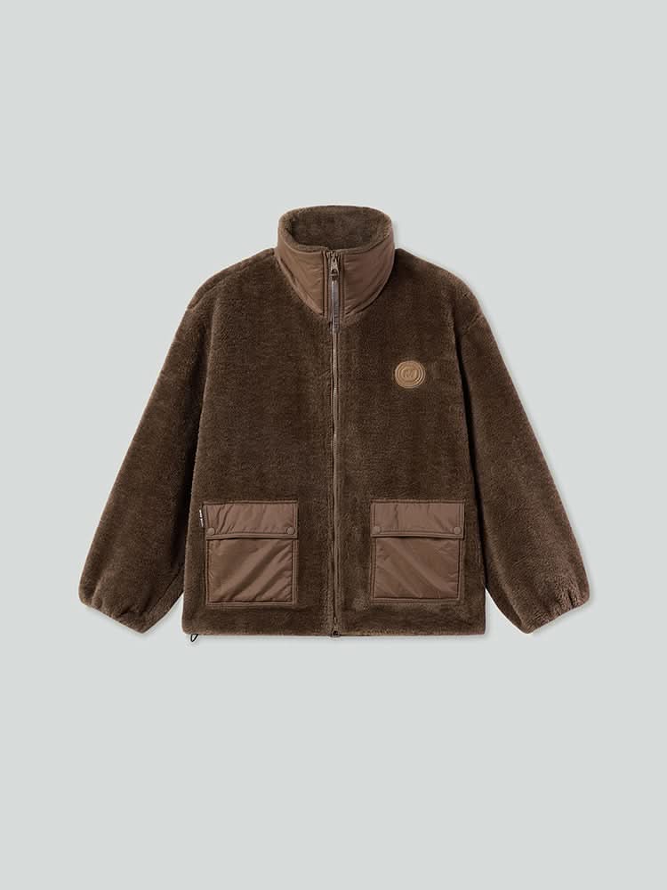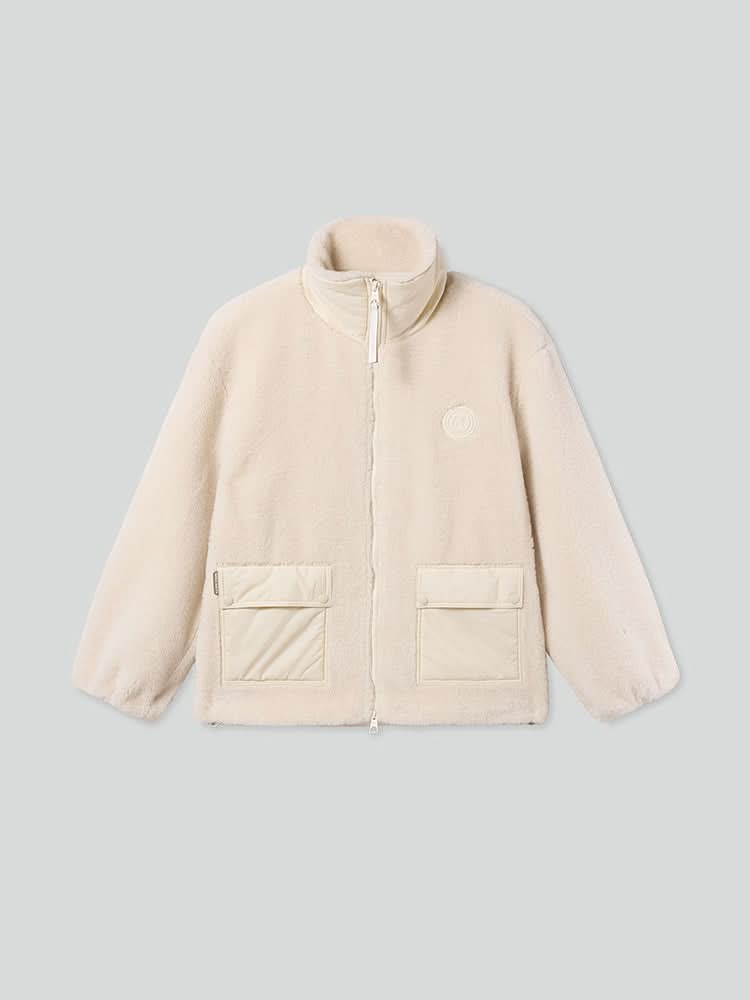 Crafted from premium faux wool, this piece mimics the soft texture of fleece with its fine, pill-resistant surface. The material is gentle on the skin, offering a luxurious and warm feel. An embossed-printing logo patch reinforces the brand's prestige ness, while contrasting material pockets add a stylish and dynamic touch. Elastic cuffs streamline the arms, infusing the design with youthful energy and mobility.