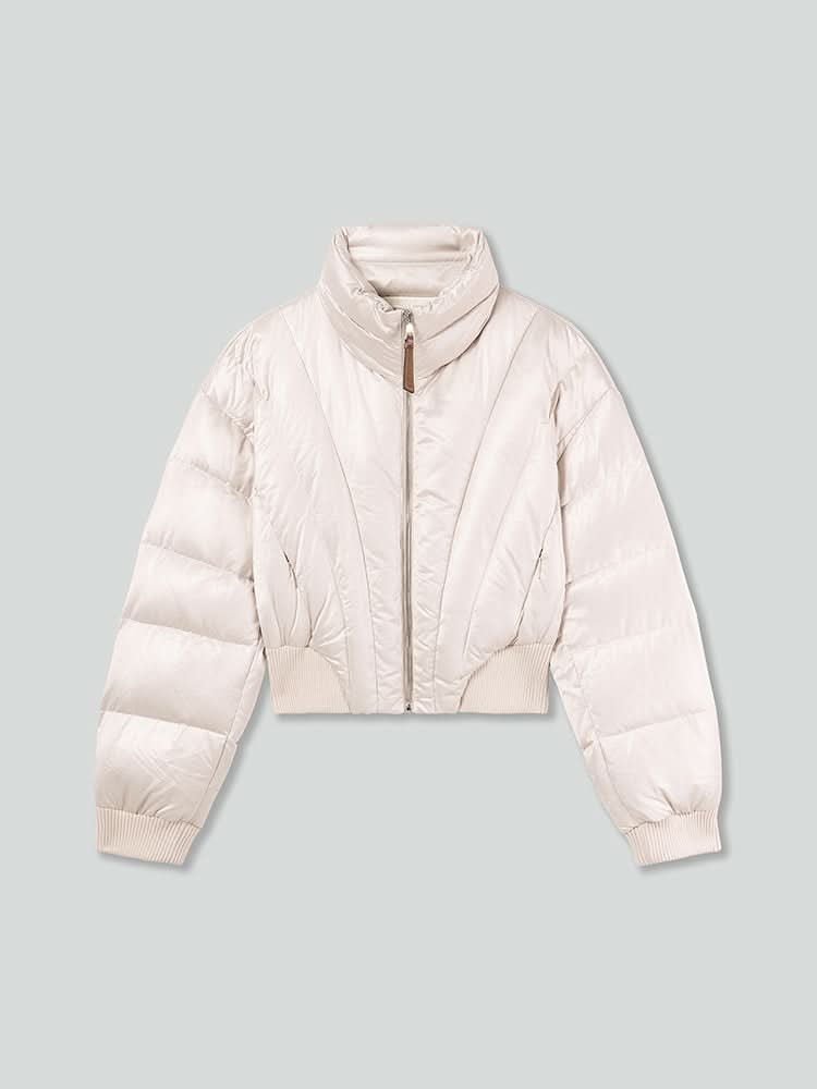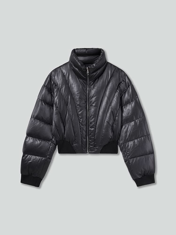 This fabric is made from high-quality Japanese polyester filament yarn. Compared to other yarns of the same diameter and material, filament yarn contains more long filaments, and these filaments are finer, giving the fabric a softer style. It uses unrefined or untwisted raw yarn to create a soft and delicate touch reminiscent of nylon. The overall fabric features a quilted texture with a leather-like appearance, complemented by a subtle sheen. The stylish stand collar, combined with a zip closure, provides dual protection against the wind, effortlessly showcasing a fashionable winter look. The zip pockets on the sides of the jacket create a sleek exterior while enhancing practicality. The finely ribbed cuffs shape the arm line, adding a polished touch.