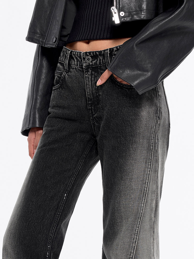 This product is crafted from premium pure cotton denim made from long, glossy Turkish cotton fibers, offering a soft and comfortable feel against the skin. The rugged texture showcases prominent slubs, and through a variety of treatments such as enzyme washing, hand scraping, snowflake fading, and staining, each piece achieves a unique and fashionable look. The waist features a vintage, distressed wash effect, with irregularly distressed details that add individuality. This seasonâââ€?/span>s upgraded leather patch, featuring a bold, raised logo, enhances the brandâââ€?/span>s premium appeal. The wide-leg cut, accented with raw edge detailing, embodies a cool and carefree street style.