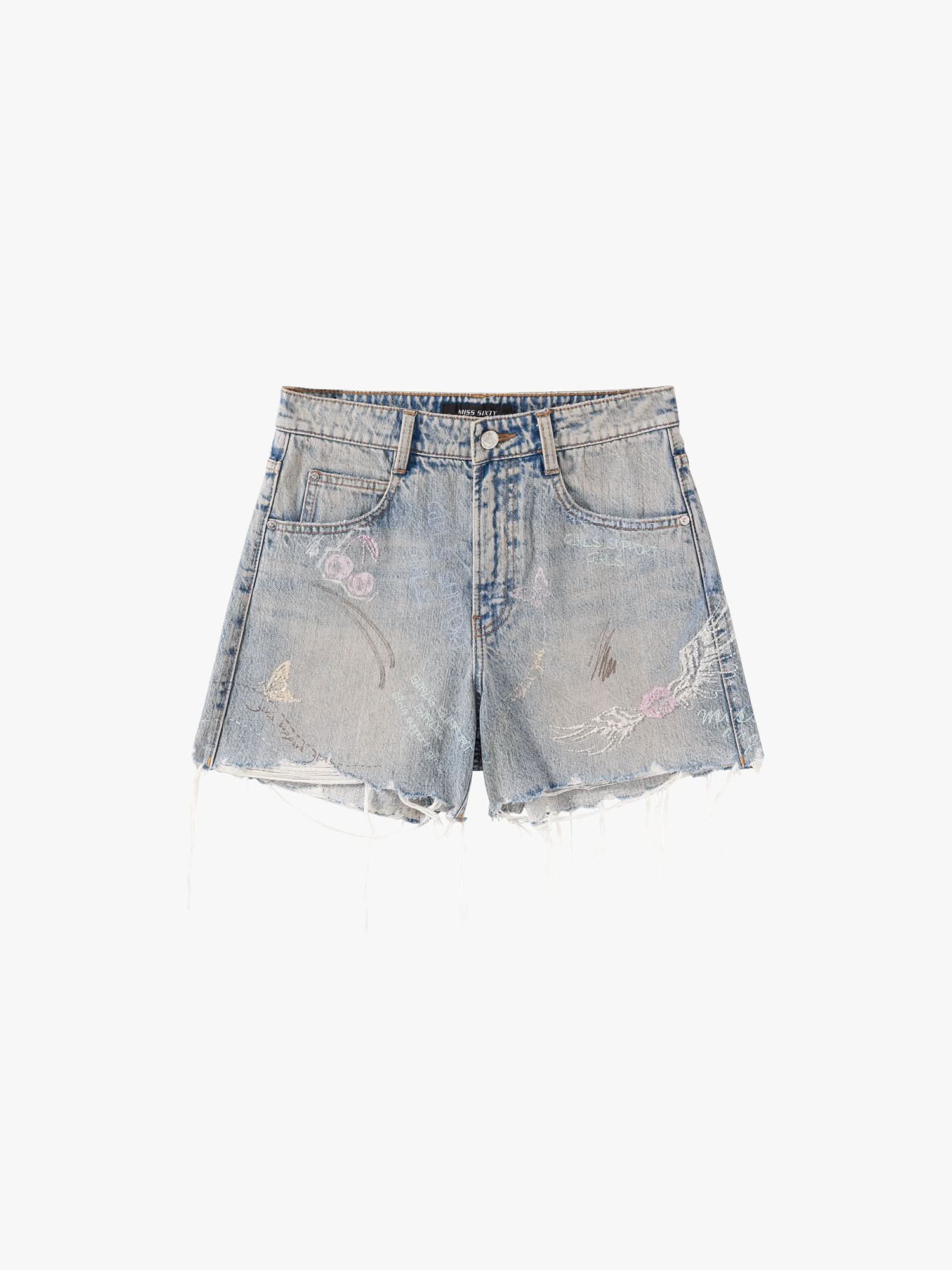 The denim shorts feature a five-pocket design, with custom buttons and angel series label details, adding a unique touch. Made from gray-blue cotton denim, the fabric feels comfortable to the touch, and the tailored short cut enhances a structured and stylish silhouette.