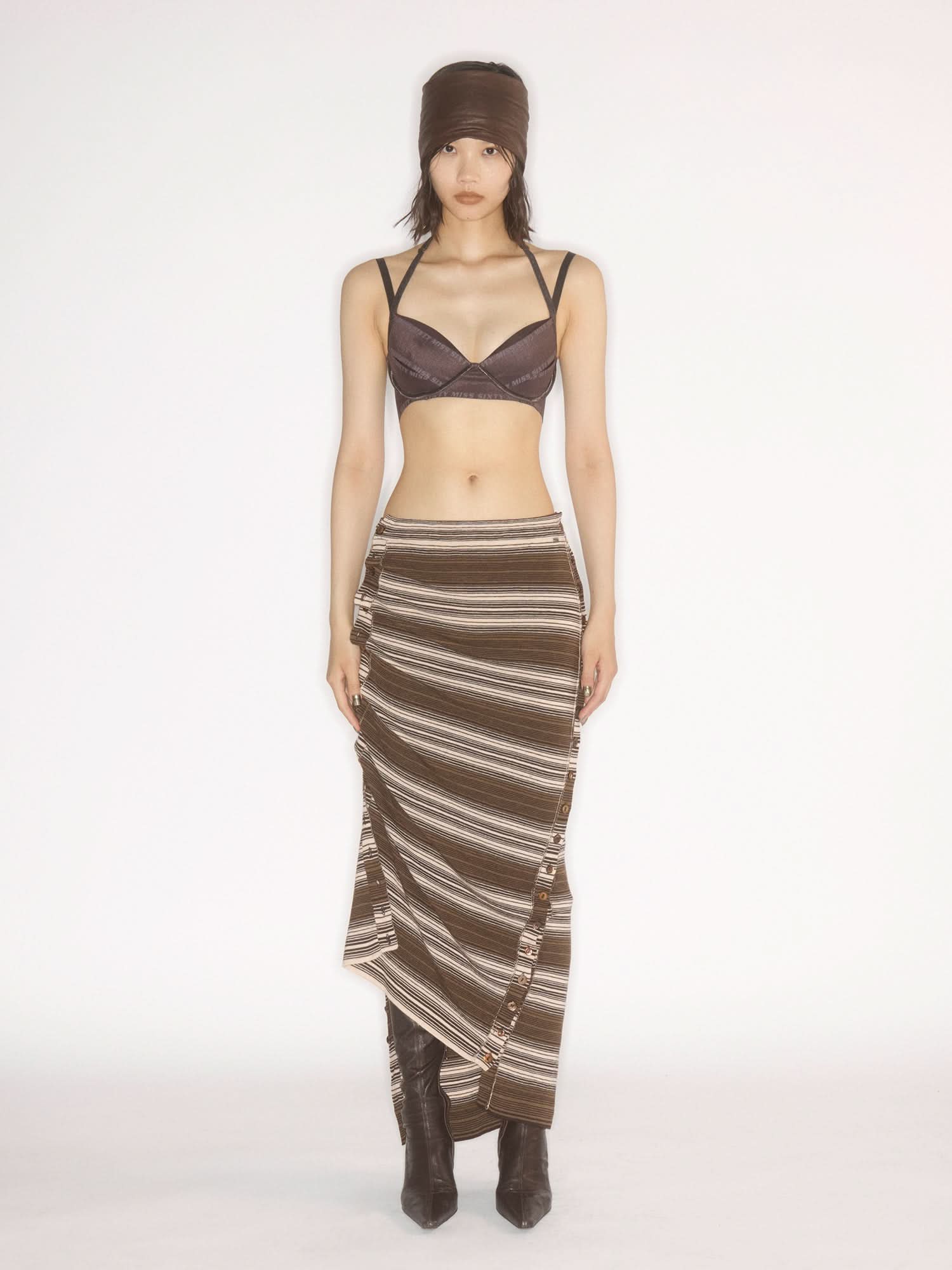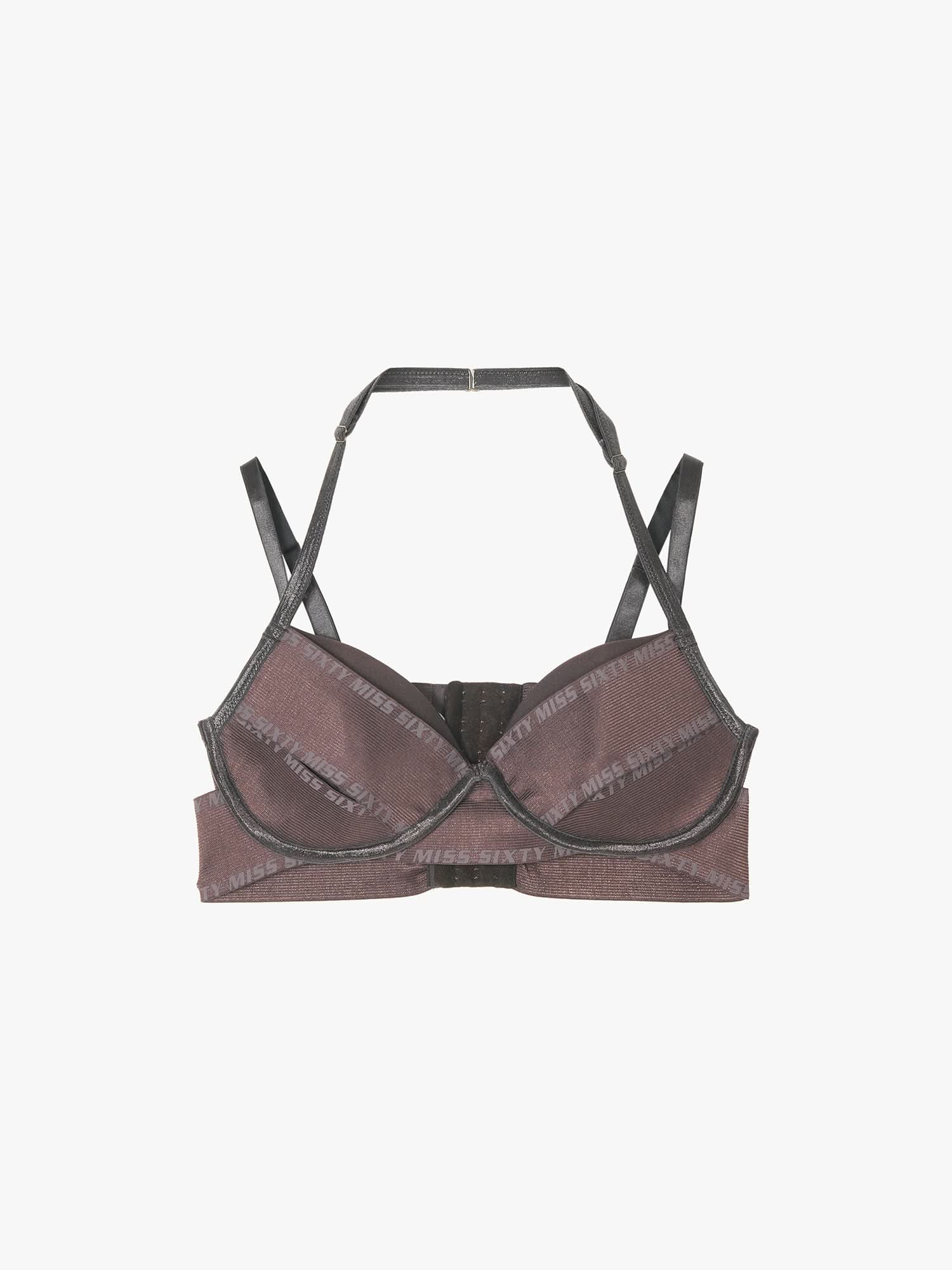 The MISS SIXTY × KNWLS collaboration features a top with a V-neck design and adjustable, detachable neck strap details. Made from specially treated elastic fabric with logo prints, its unique cut-and-sew construction highlights a bold and edgy aesthetic.