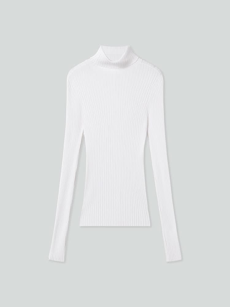 Crafted from high-quality core-spun yarn fabric, this material features a polyester core with a viscose outer layer, resulting in a plush, soft texture that feels warm and comfortable against the skin. The cozy high-neck design wraps around the neck elegantly, enhancing a sophisticated and refined appearance. The tailored fit at the hem accentuates a slim silhouette, while the ribbed texture visually slims the figure. The logo woven into the sleeve adds a trendy touch, highlighting the playful design elements.