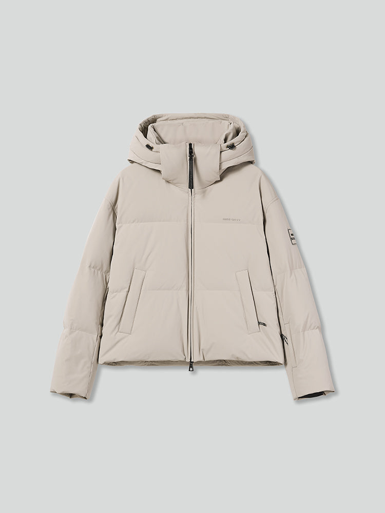 Made from high-quality nylon-blend fabric with a high-density weaving process, this material is structured and resistant to sagging. It has a delicate texture and provides a crisp, sharp fit while exuding a stylish, sophisticated look. The interior is filled with fluffy 90% white duck down, featuring large down clusters with minimal quills for warmth. The casual hooded design, combined with a stand collar, better wraps around the neck, providing wind protection and warmth. The zipper side pockets add detail and practicality. The sleek cuffs enhance the arm silhouette, while the integrated thumbhole sleeves offer both fashion and warmth.