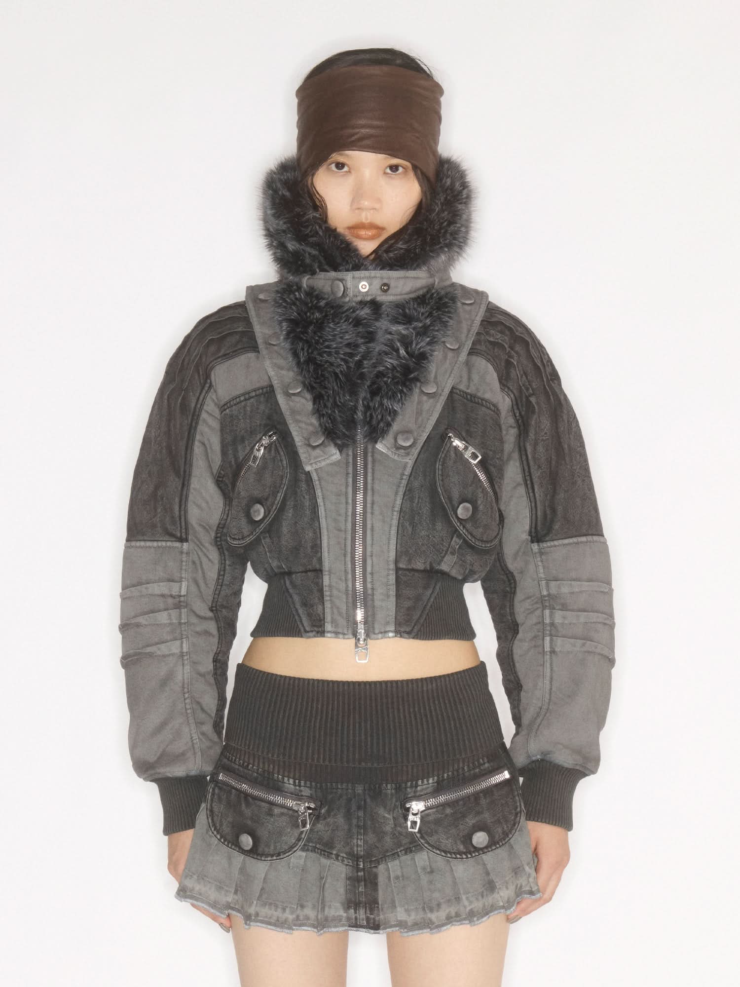 The MISS SIXTY × KNWLS collaboration features a padded denim jacket with a detachable fur collar, and a collar tab that can be fastened to create a stand-up collar effect. Crafted from specially treated lyocell denim with nostalgic washing and dyeing techniques, the fabric is soft, drapey, and structured. Contrasting color block panels refresh the visual appeal, while the unique deconstructed cut and cropped silhouette embody a futuristic aesthetic.