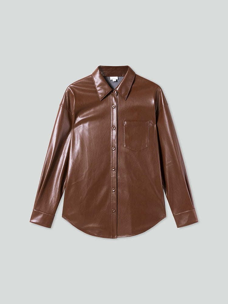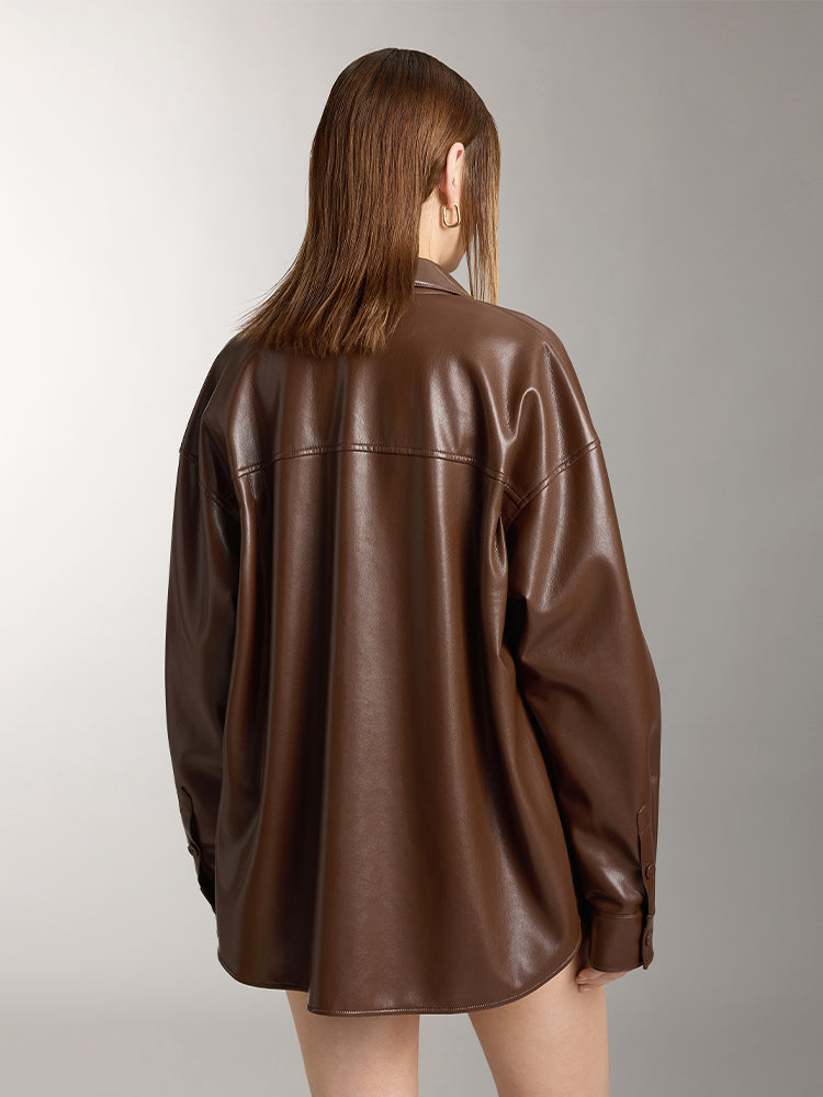 Crafted from skin-friendly protein PU faux leather, this fabric is soft yet resilient, with a smooth, refined texture and a natural sheen. It feels lightweight and comfortable while being easy to maintain. The classic shirt collar is complemented by leather-covered buttons on the placket, showcasing meticulous craftsmanship and enhancing the overall quality. The back features pleated detailing, creating a relaxed, roomy fit for effortless comfort. Side pockets add both practicality and a touch of casual style.