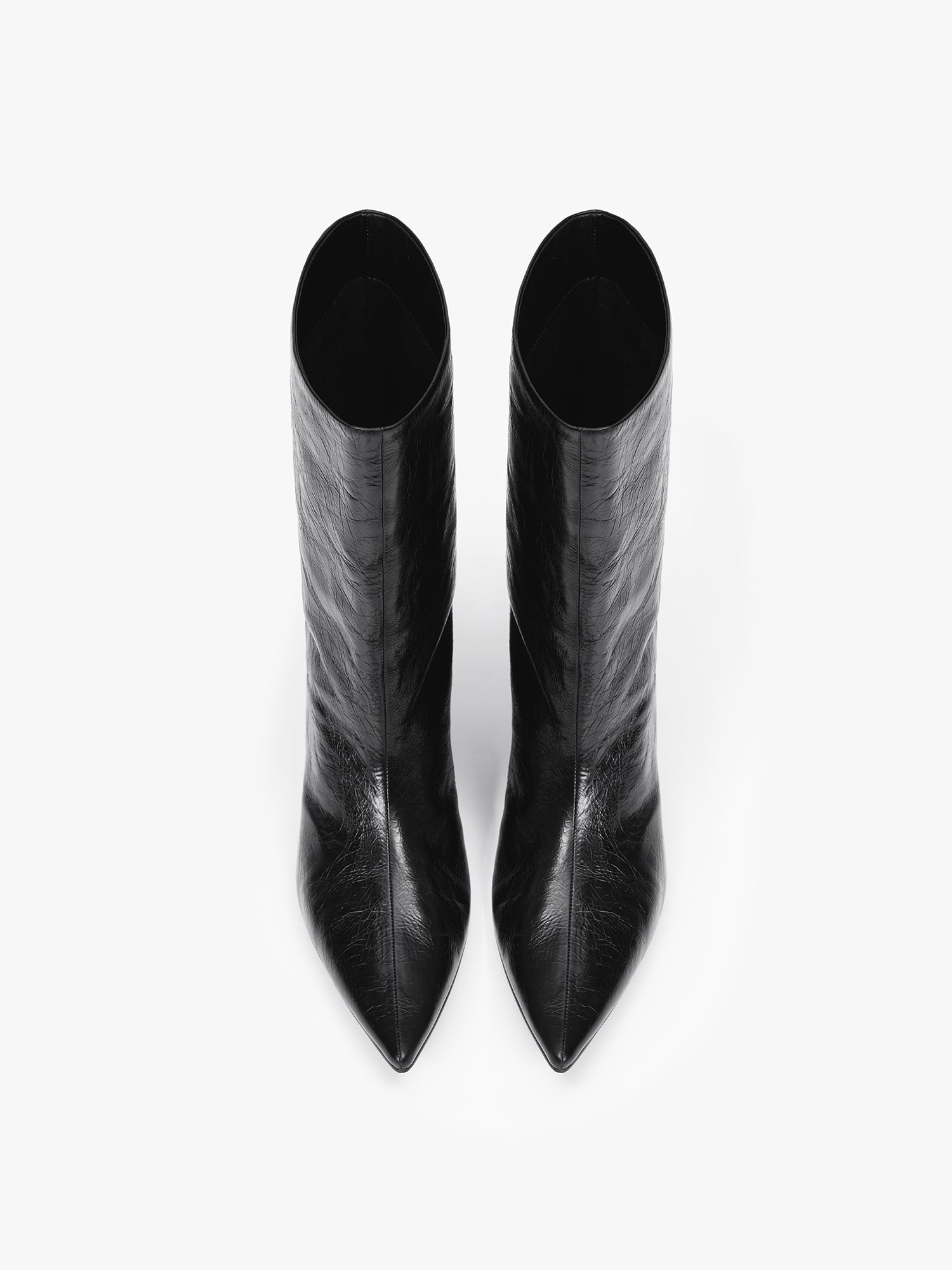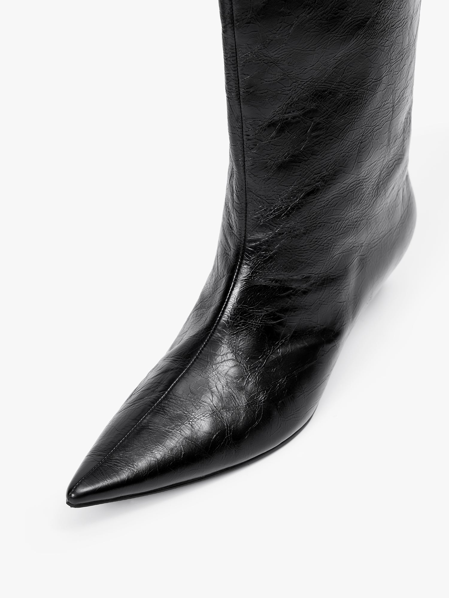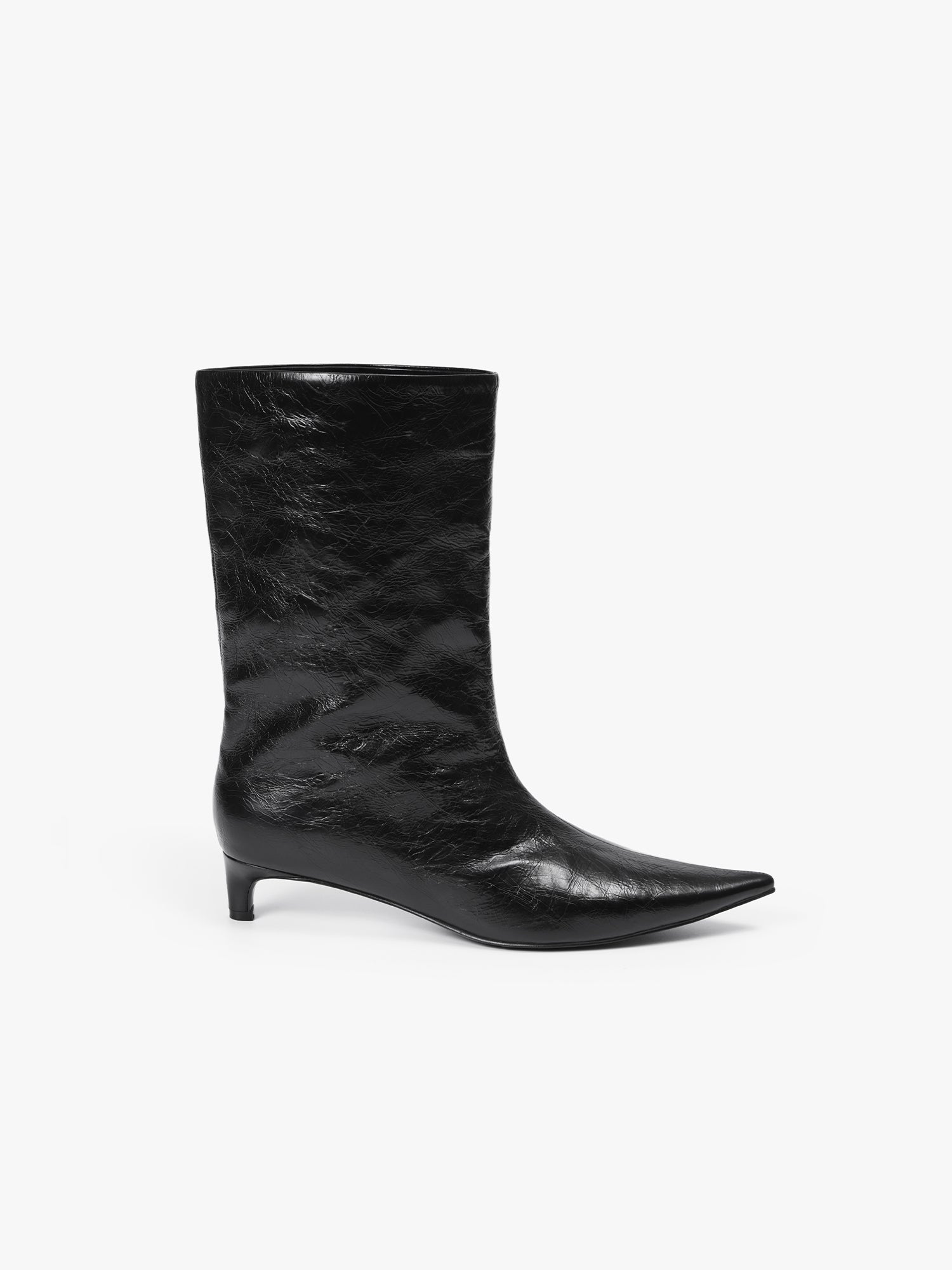 These mid-calf, mid-heel shoes feature a minimalist slip-on design for a sleek, commanding look. The pointed toe and stiletto heel add a touch of elegance, while the premium leather construction ensures comfort and a sophisticated finish.