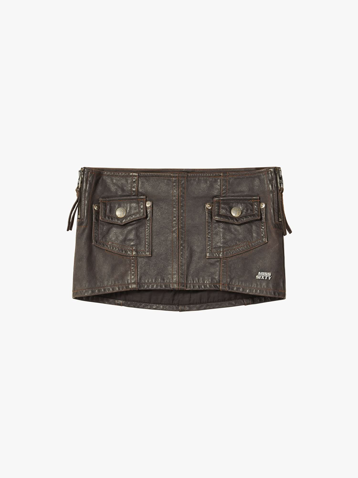 The MISS SIXTY × KNWLS collaboration features a genuine leather mini skirt with a straight cut and low-waist design. Structured flap pockets and stitched detailing highlight a utilitarian style. Made from split cowhide leather, the material is smooth with medium thickness, and specially treated to create a cracked effect, enhancing the distressed look for a bold, edgy aesthetic.