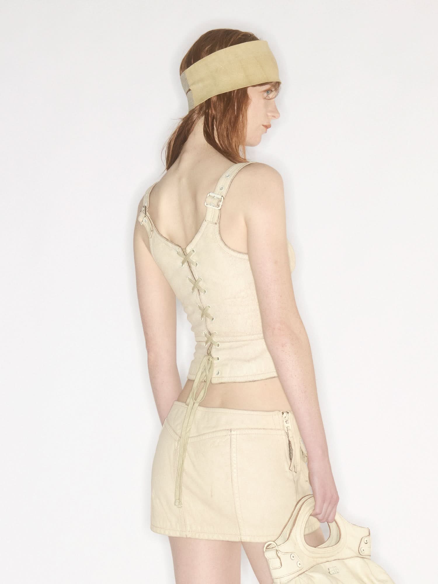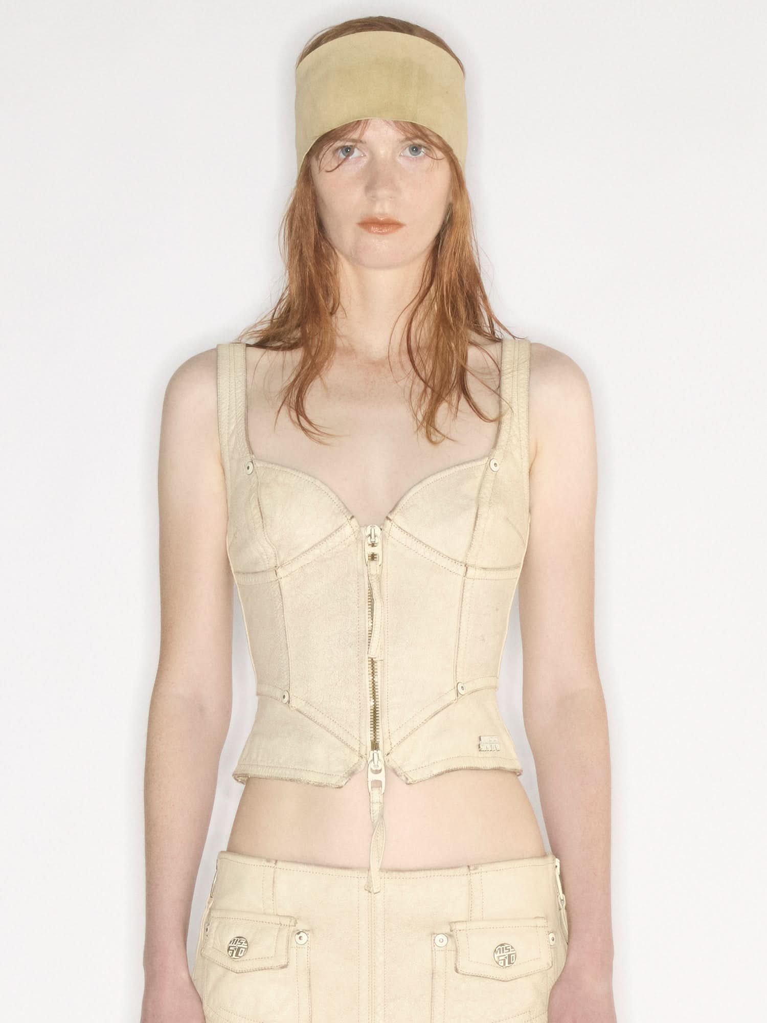 The MISS SIXTY × KNWLS collaboration features a genuine leather vest with a two-way zipper front. Its unique corset-style cut and back lace-up detail naturally accentuate a sensual silhouette. Crafted from specially treated cowhide leather combined with nostalgic techniques, it showcases a distressed cracked effect, embodying a futuristic aesthetic.