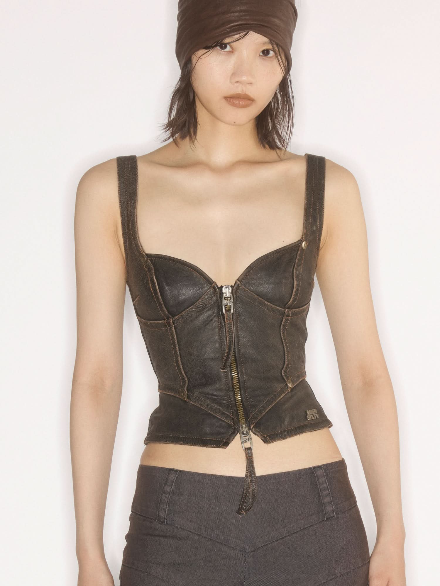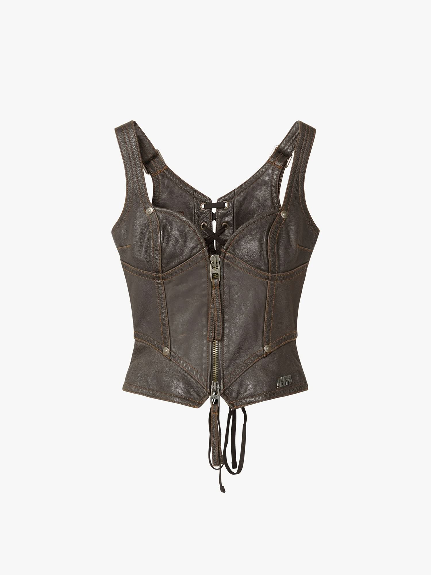 The MISS SIXTY × KNWLS collaboration features a genuine leather vest with a two-way zipper front. Its unique corset-style cut and back lace-up detail naturally accentuate a sensual silhouette. Crafted from specially treated split cowhide leather combined with nostalgic techniques, it showcases a distressed cracked effect, embodying a futuristic aesthetic.