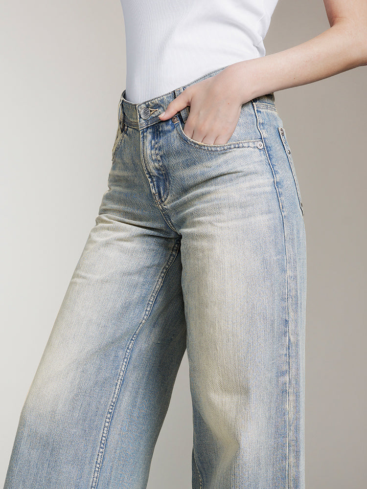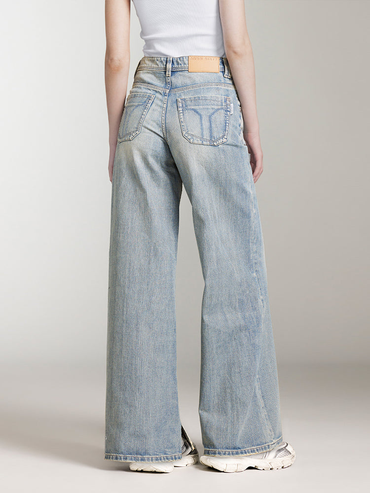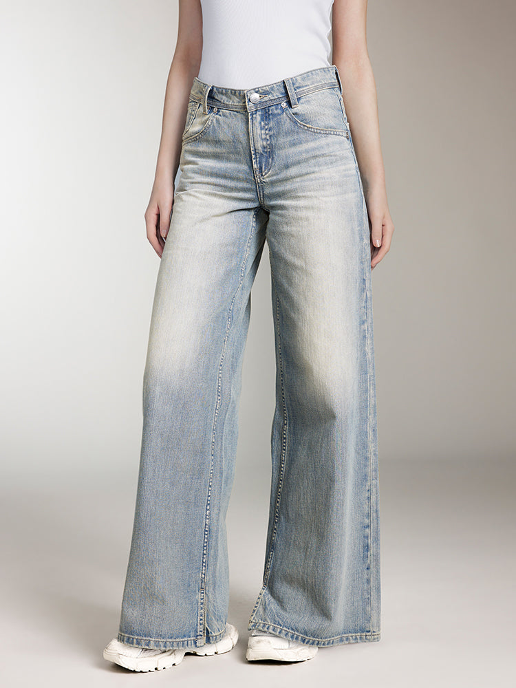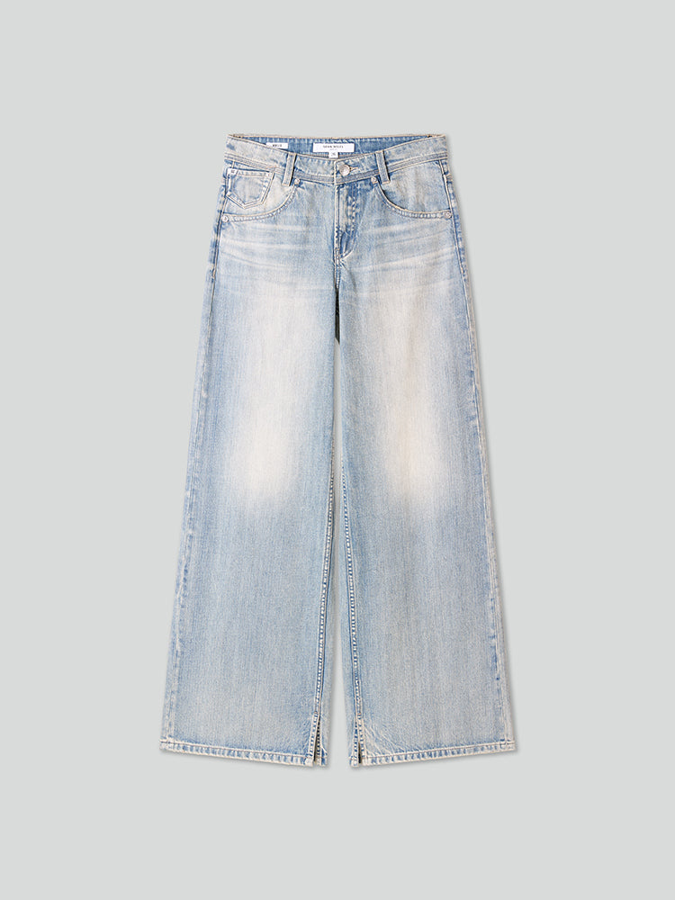 Carefully selected full cotton vintage fabric, sourced from Turkey where cotton fibers are long and possess a good surface luster. The denim crafted from this material offers a comfortable and soft wearing experience, with a rugged texture and a structured yet stylish appearance. The fabric has a full and rich hand feel, enhanced through multiple processing techniques, resulting in a rich vintage denim style with varying levels of wash. The distinctive irregular front pocket design pays homage to classic denim while adding a unique touch of fashion. The asymmetrical design of the side pull-tab back pockets enhances the visual appeal of lifted buttocks. The loose wide-leg trouser style provides a comfortable wearing experience, while the inner slits add a fashionable detail, showcasing a modern attitude.