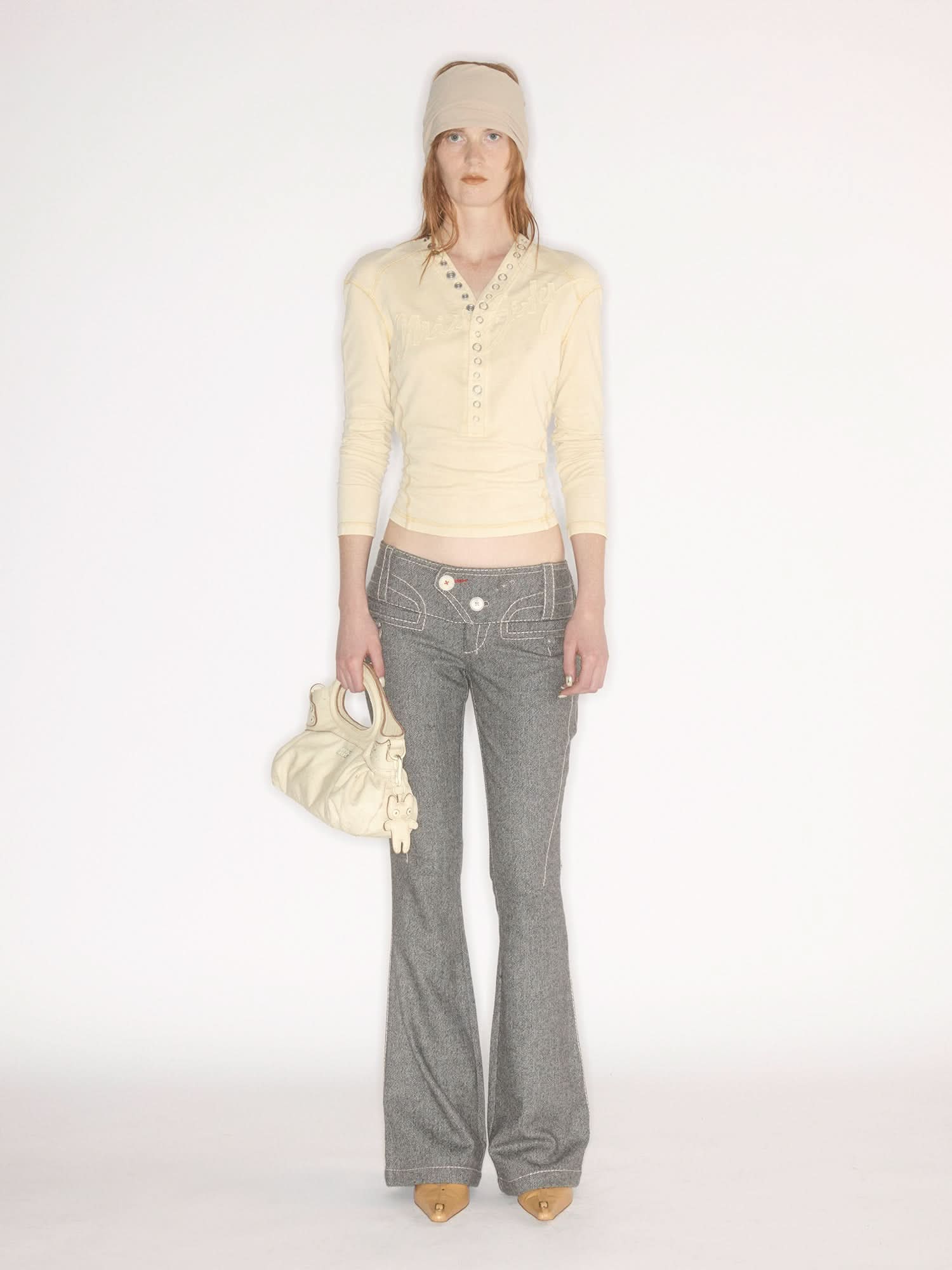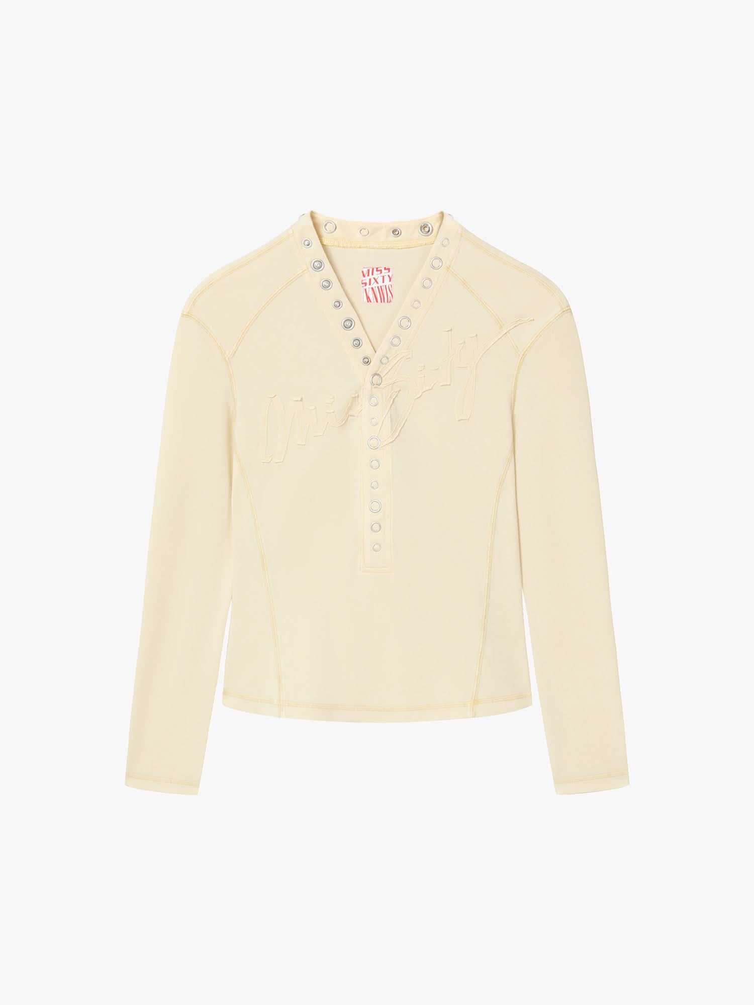 The MISS SIXTY × KNWLS collaboration features a T-shirt with a V-neck design and metal snap button details at the collar. Crafted from specially treated stretch piqué fabric using nostalgic dyeing techniques, it feels soft and comfortable against the skin. Contrasting stitching outlines deconstructed lines, adding a bold, edgy personality.