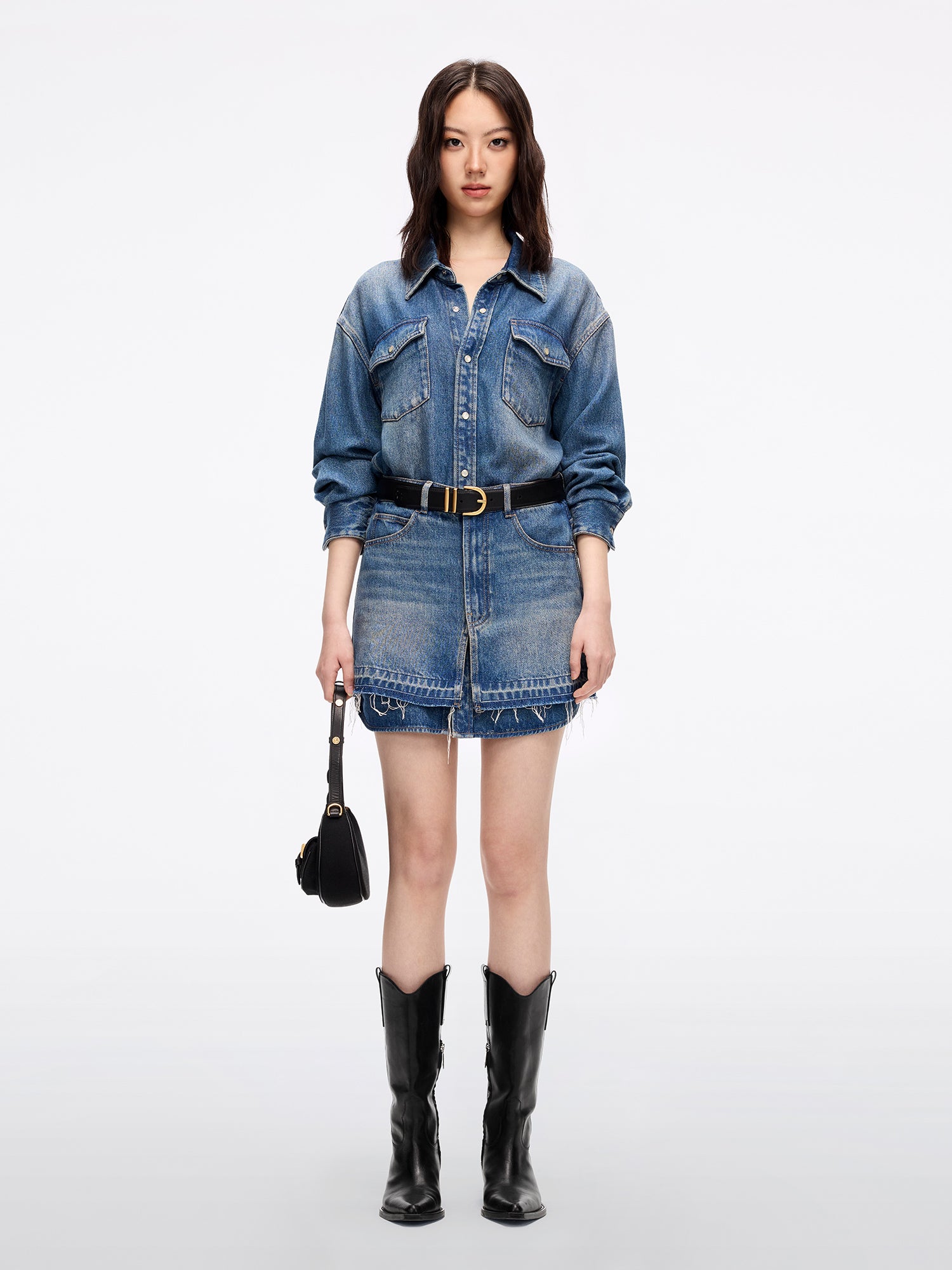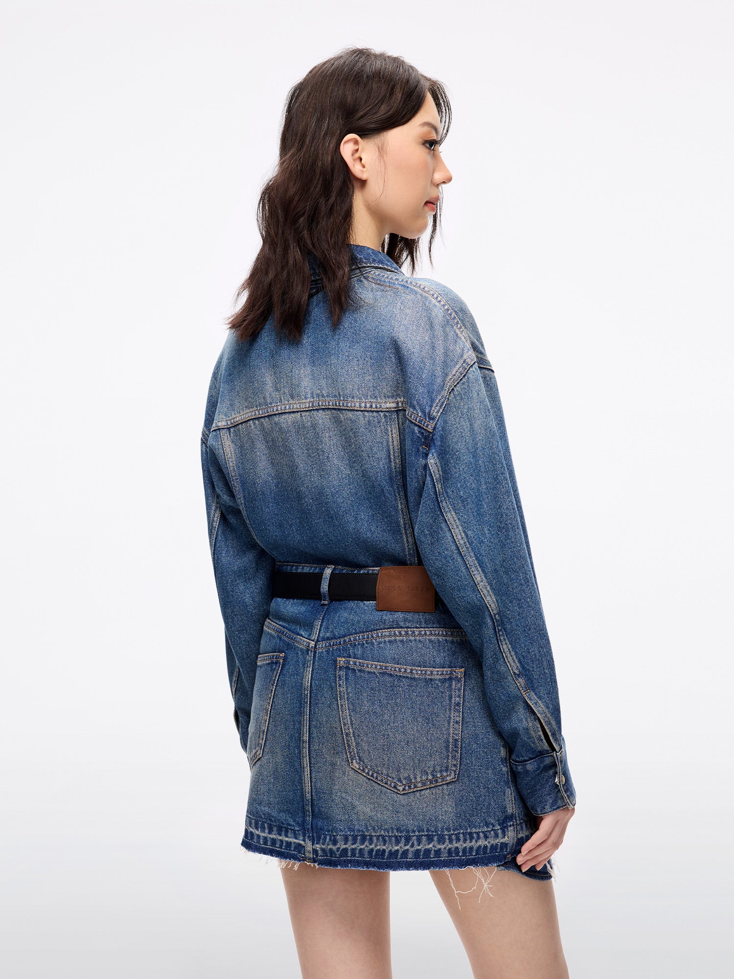 Crafted from premium Lyocell denim, this fabric features the "breathable fiber" Lyocell component, which enhances the drape of the denim. The appearance is smooth and even, with a natural and vibrant color that feels soft against the skin. It drapes well and is comfortable to wear, providing a naturally stylish look. The classic shirt collar, lightly distressed style, and glossy snap buttons add a touch of vintage charm. The leather label at the back waist has unique subtle variations in texture and color, resulting in a distinct visual effect. The faux two-piece design and half-open front placket enhance wearability and add a playful fashion element.