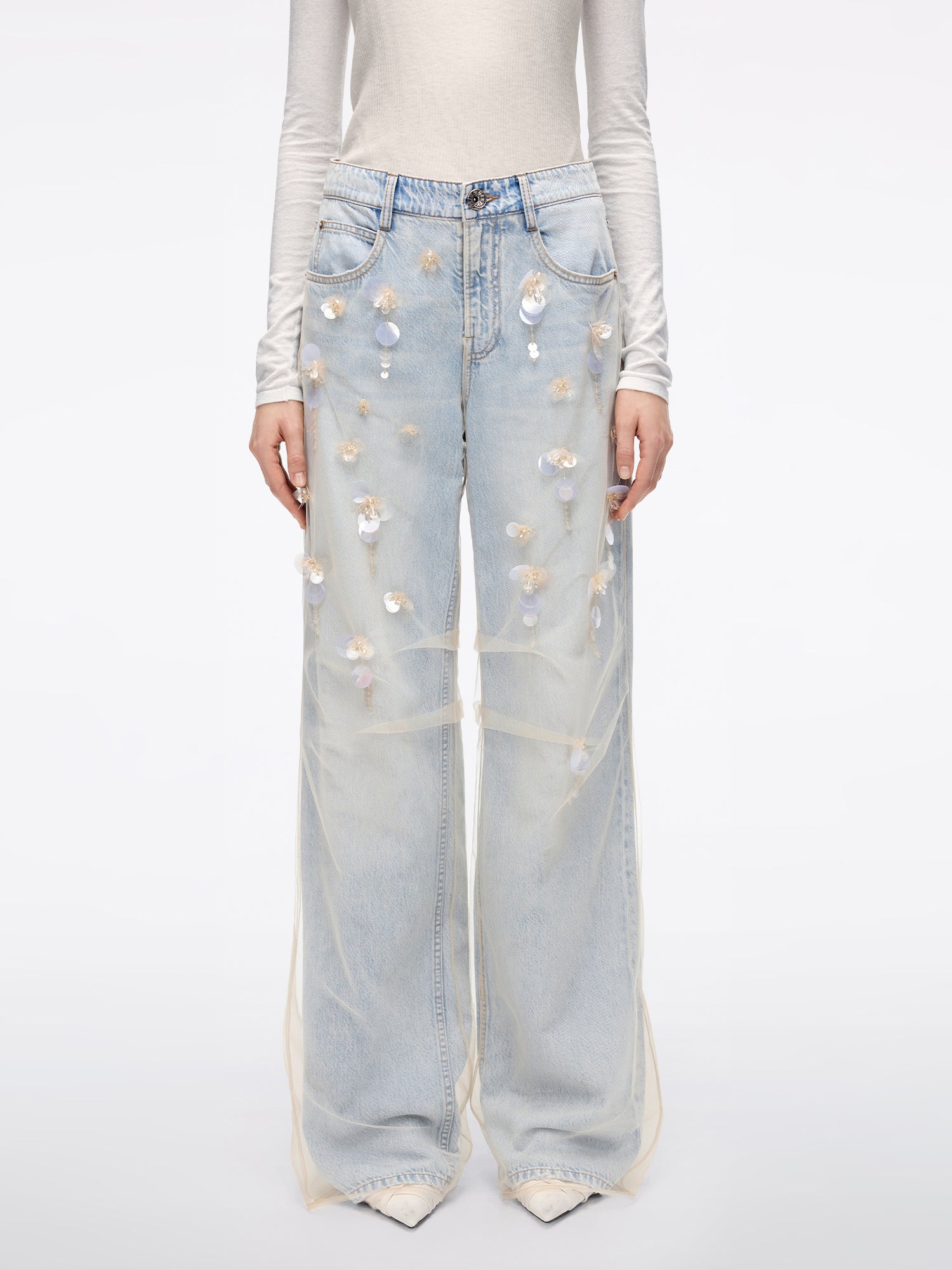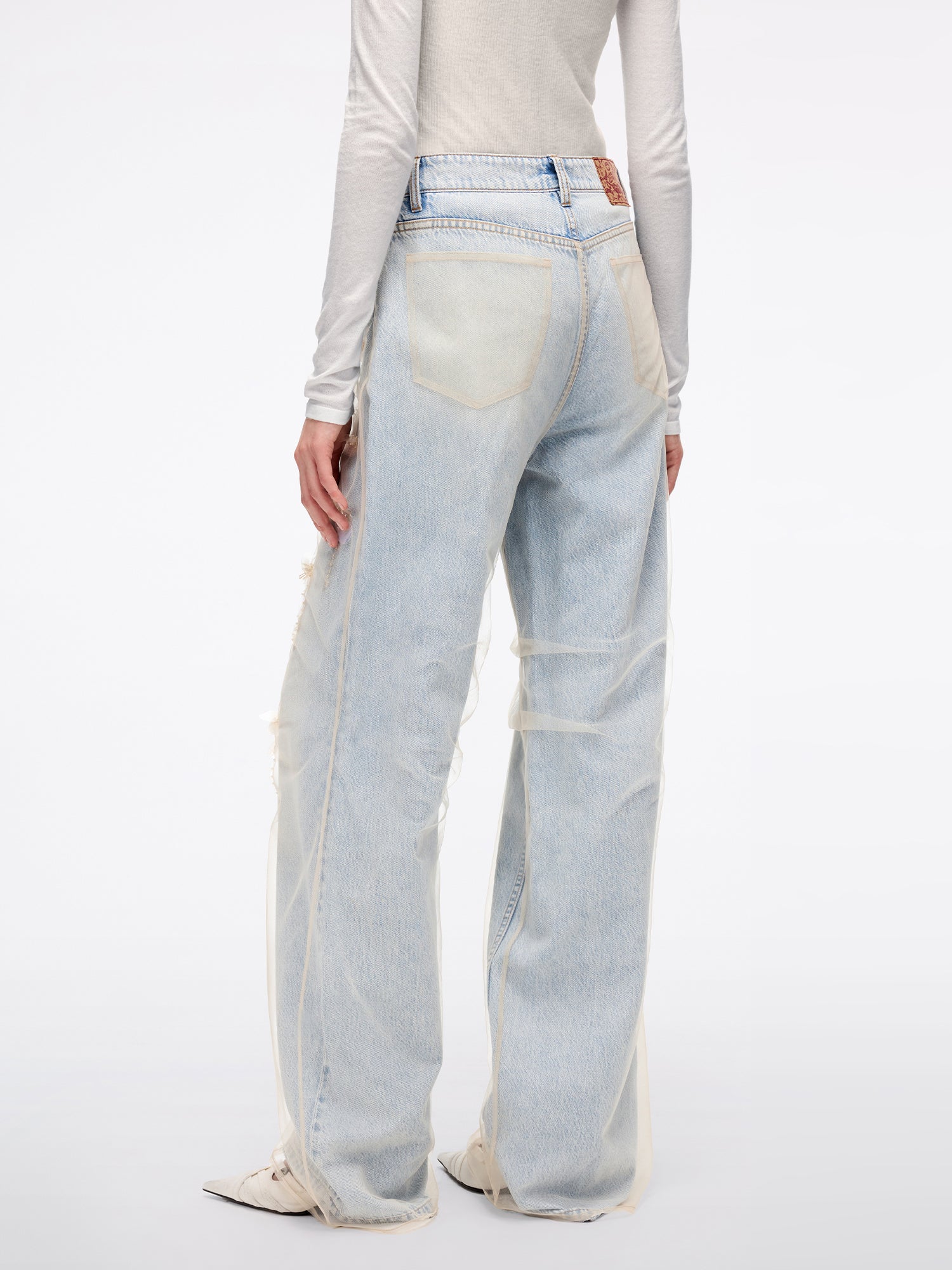 Made from Tencel cotton denim, this fabric features a natural drape and a soft, smooth feel, ensuring excellent comfort. The outer layer is complemented by mesh paneling, adding a lightweight and airy touch. The custom logo button highlights the brand's value. The all-over lip print leather tag combined with the yoke seam enhances the lift at the back, while the mesh design creates a multi-layered visual effect. The pant legs are finished with distressed details, making each piece unique.