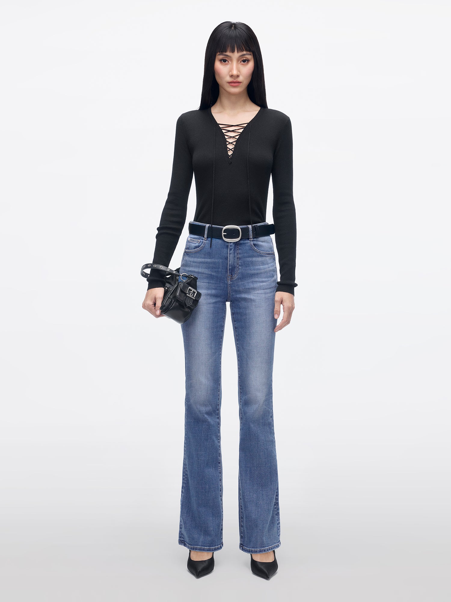Made from cotton fibers sourced from Turkey, which are fine and lustrous, the denim fabric offers a soft and comfortable wearing experience. The fabric has a rich feel and incorporates Lyocell, a breathable fiber, which adds a smooth drape and a soft touch. After multiple processes, the fabric showcases slight slubs, giving each piece a unique, classic vintage vibe. Custom buttons and a quality zipper placket highlight the high-quality craftsmanship in the details. A custom brown leather label complements the vintage blue wash, creating an eye-catching design. The flare cut of the pants blends retro and modern aesthetics for a bold statement.