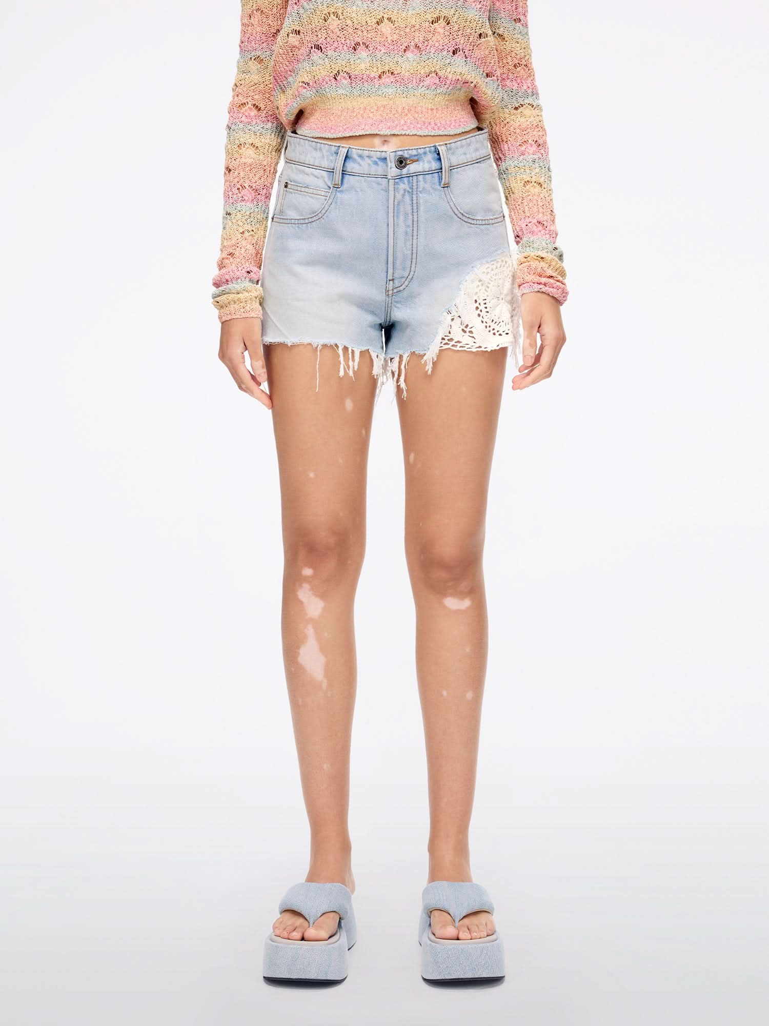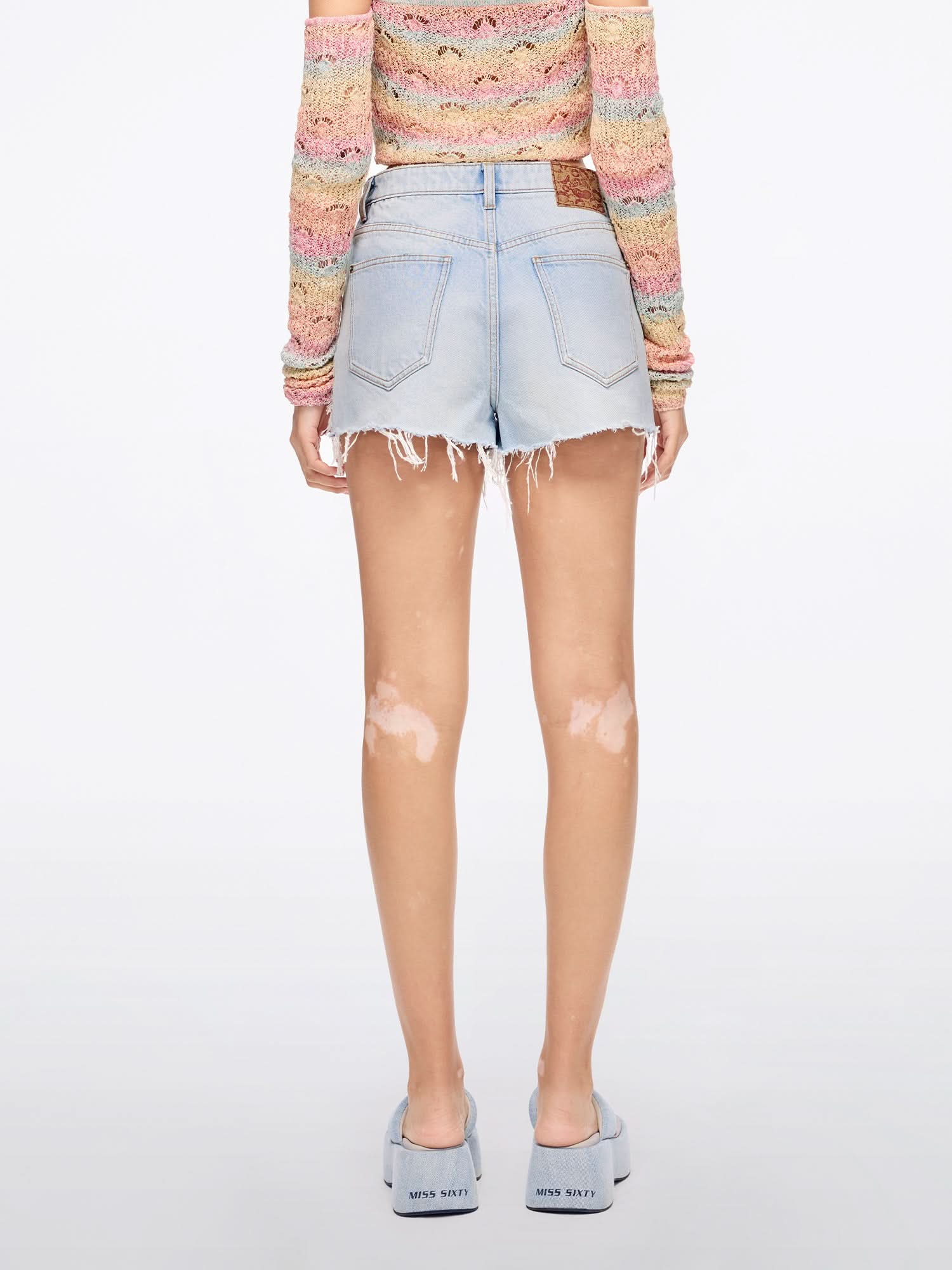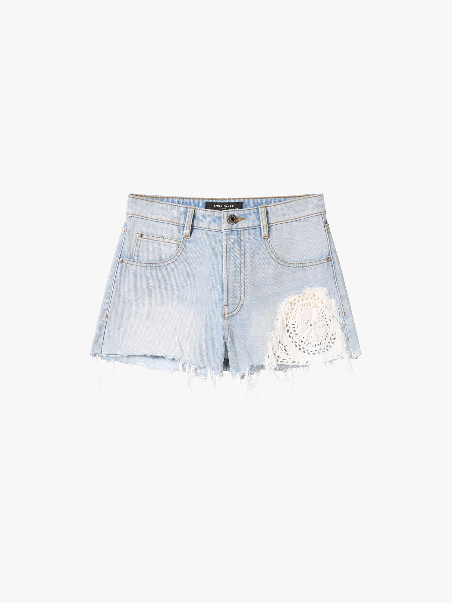 Trendy denim shorts feature a high-waisted silhouette and classic five-pocket design. Bohemian-style woven distressed patchwork adds a romantic Italian vintage touch. Made from light blue cotton denim with a tailored fit, they offer comfort, softness, and a structured shape. Each piece undergoes multiple washes and finishing processes, ensuring a unique look every time.