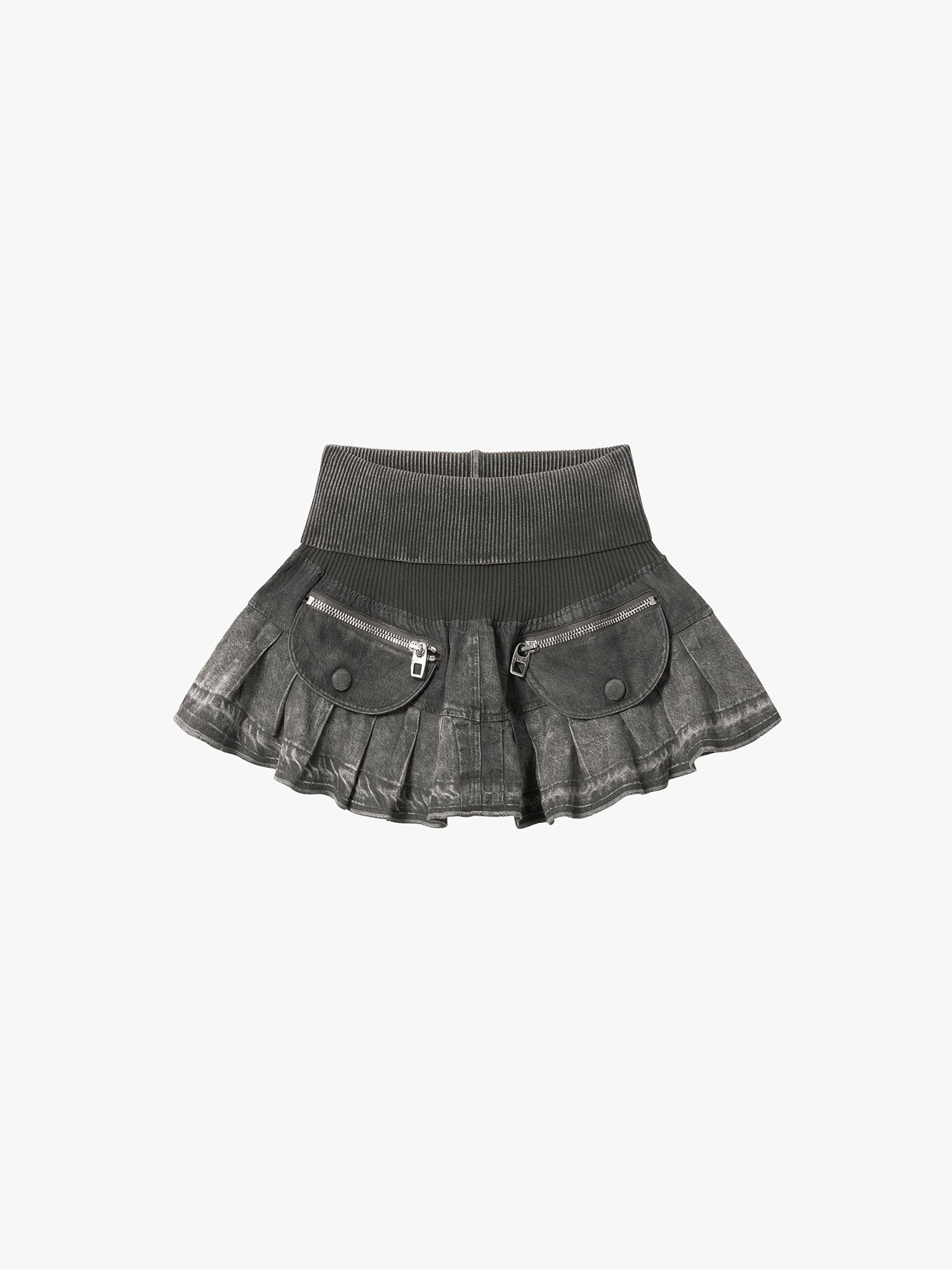 The Miss Sixty x KNWLS Collection features a skirt with a patchwork fold-over ribbed elastic waistband, allowing adjustable high- or low-waist styling. Metal zippered flap pockets and a short-cut silhouette create a bold, edgy look. Made from soft, drapey lyocell denim, the skirt maintains a structured fit, while special dyeing and nostalgic washing techniques convey a futuristic aesthetic.