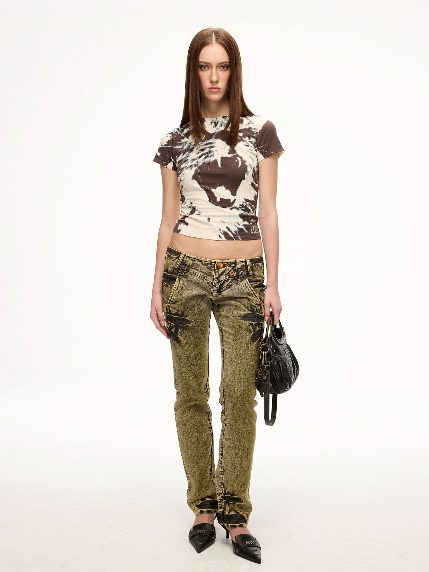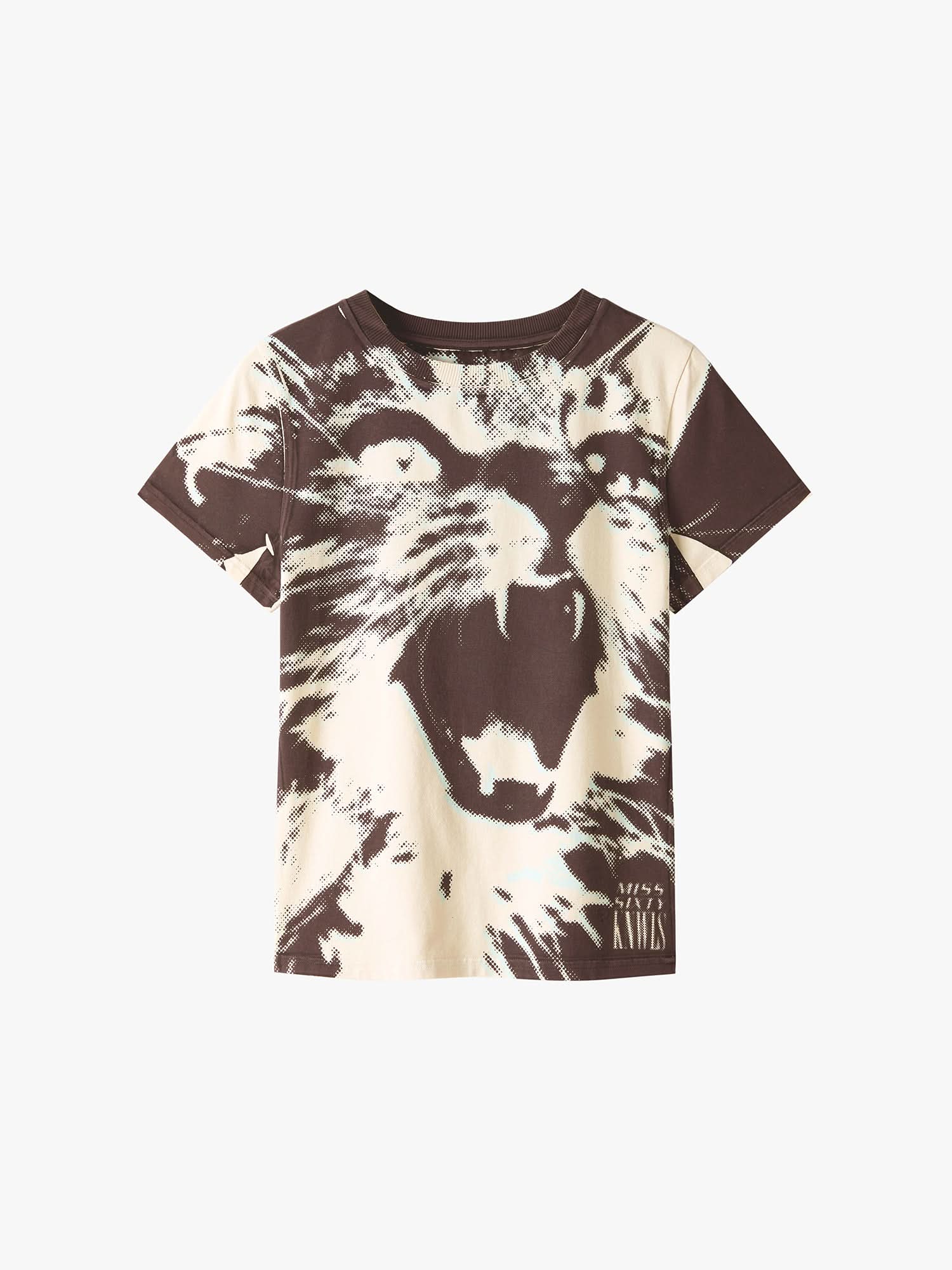 MISS SIXTY × KNWLS collaboration series. This T-shirt features a slim-fit silhouette and a crew-neck design. The cat-head graphic is presented in a retro halftone style, creating a strong visual impact, while the collaborative logo print decorates the hem. Made from a cotton-spandex knit fabric, it feels soft and lightweight, fitting closely to the body's curves for a comfortable and effortless wear.