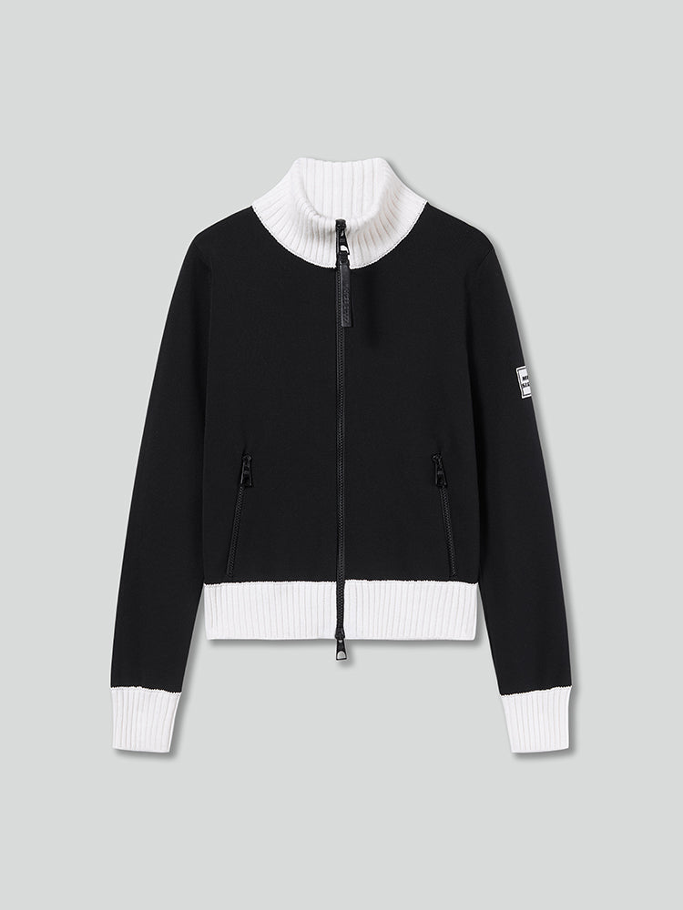 Made from high-quality Japanese-imported yarn, the fabric has a smooth surface and rich color. The refined knitting technique provides excellent elasticity, with a soft, comfortable feel. It drapes well while maintaining a structured appearance, offering a fitted and stylish look. The minimalist stand collar design comfortably wraps around the neck, providing light warmth and wind protection. The logo adds a distinctive touch, while the contrast design creates a striking visual effect. The wide contrast ribbed hem enhances the silhouette, creating a clean, sharp shape and emphasizing a sleek posture.