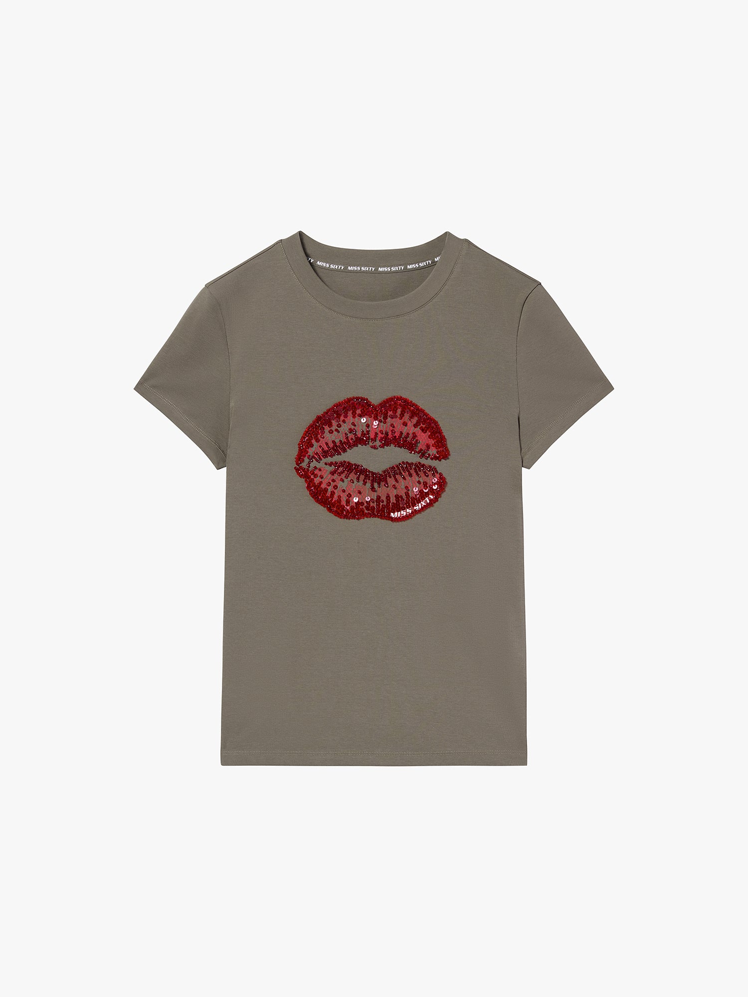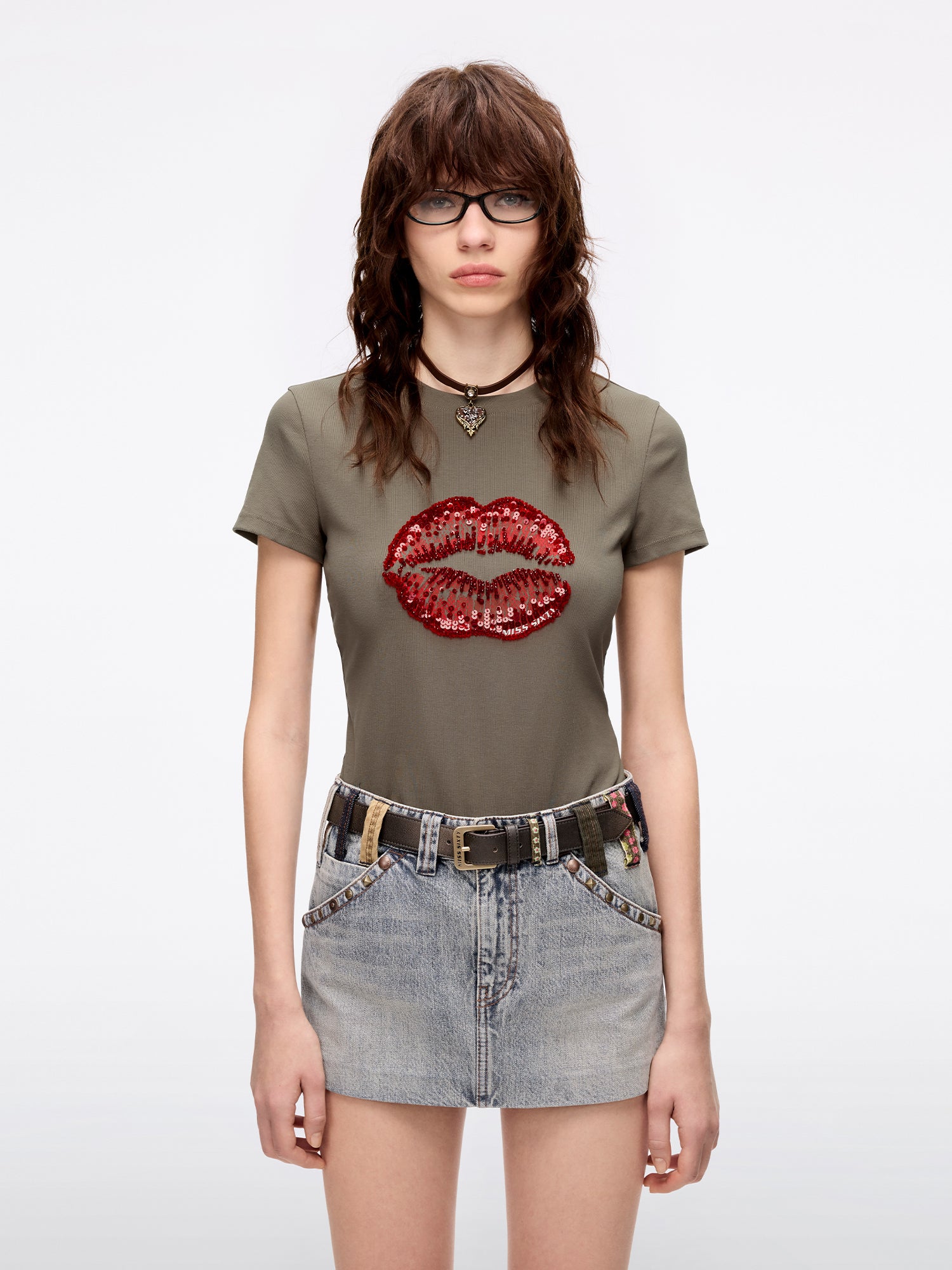 Made from cotton ribbed knit fabric, this garment has a delicate and soft texture, providing a structured fit that feels comfortable and natural against the skin. The classic round neckline features a logo woven tape on the inner collar, ensuring it retains its shape without sagging. The replicated lip design is enhanced with sequin-embroidered red lip prints on the front, adding a playful and eye-catching detail. The raglan cut creates a flattering silhouette, contributing to a slimming effect while maintaining a stylish appearance.