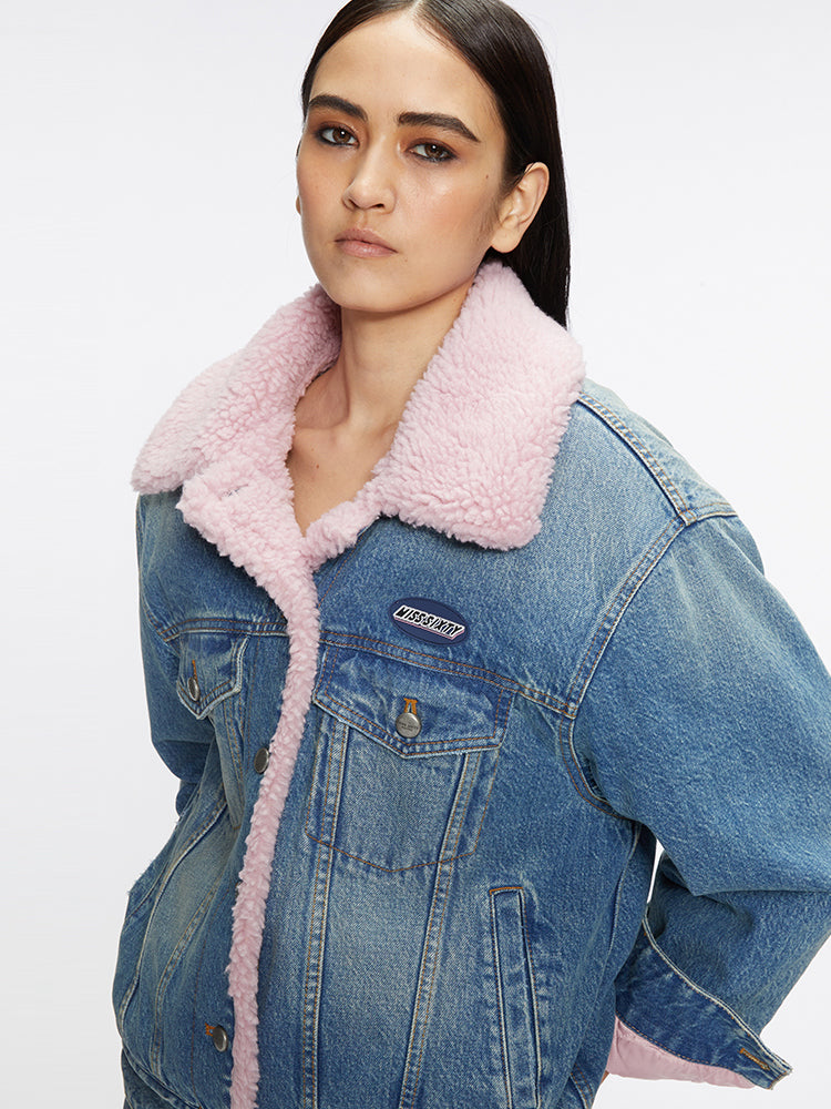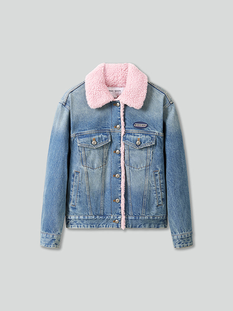Crafted from skin-friendly Egyptian cotton fabric, this piece features a crosswise bamboo stripe style, with clear, glossy weaving and a smooth, delicate touch. The distressed wash effect creates a layered, vintage hue that feels natural and unobtrusive. The main body is lined with lamb wool-style fabric, while the sleeves are adorned with quilted design for a warm and stylish wearing experience. The eye-catching lamb wool patchwork collar adds a cozy and fashionable touch. The small silicone logo embellishment enhances the detail and adds a trendy vibe. The hem is decorated with multiple buttons, allowing for adjustable comfort.