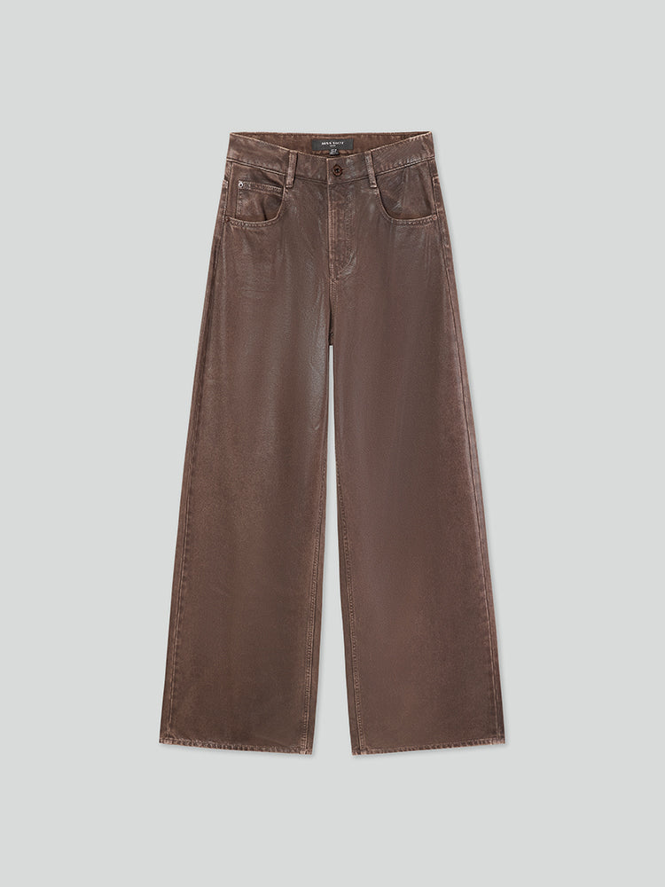 Crafted from selected cotton semi-bleached denim, this fabric features long cotton fibers sourced from Turkey, offering excellent luster. The fine twill and smooth surface provide a rich, textured feel. Through enzymatic washing, dyeing, and an all-over PU coating process, it showcases a bamboo-like texture with clear twill patterns, creating a structured appearance that ensures comfort. The distressed buttons pair seamlessly with a comfortable waistline, enhancing the overall sophisticated color gradient. The high-quality brown leather tag exudes a vintage charm, while the yoke seam accentuates the curves of the hips. The straight-cut design flatters the leg shape, concealing any unwanted bulk, with each pant leg featuring unique faded details.