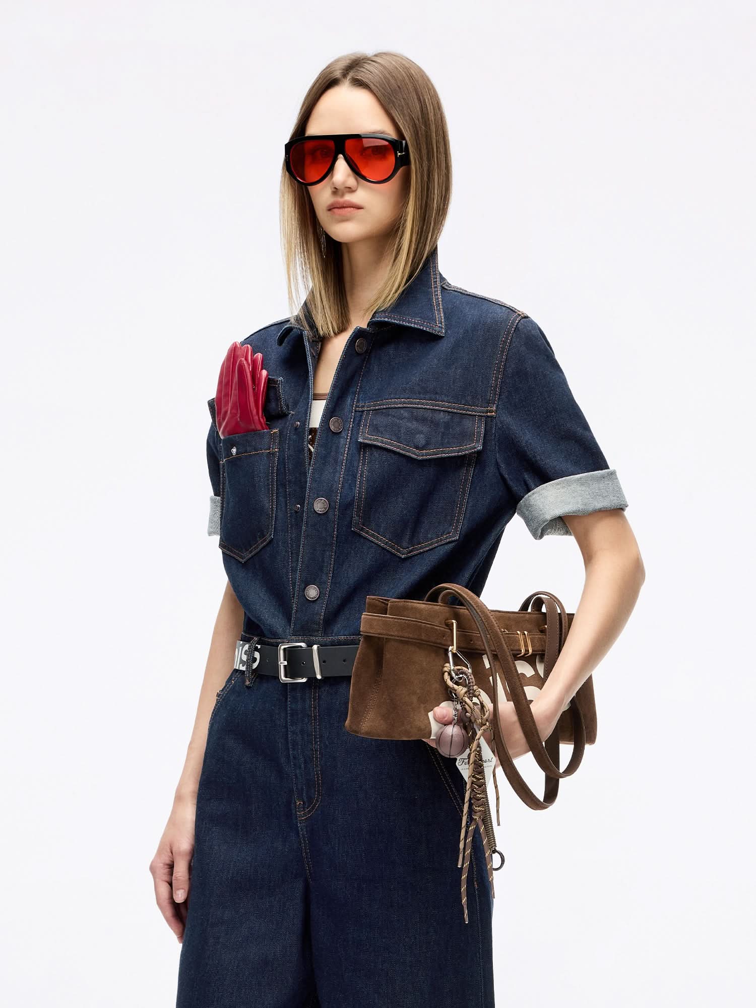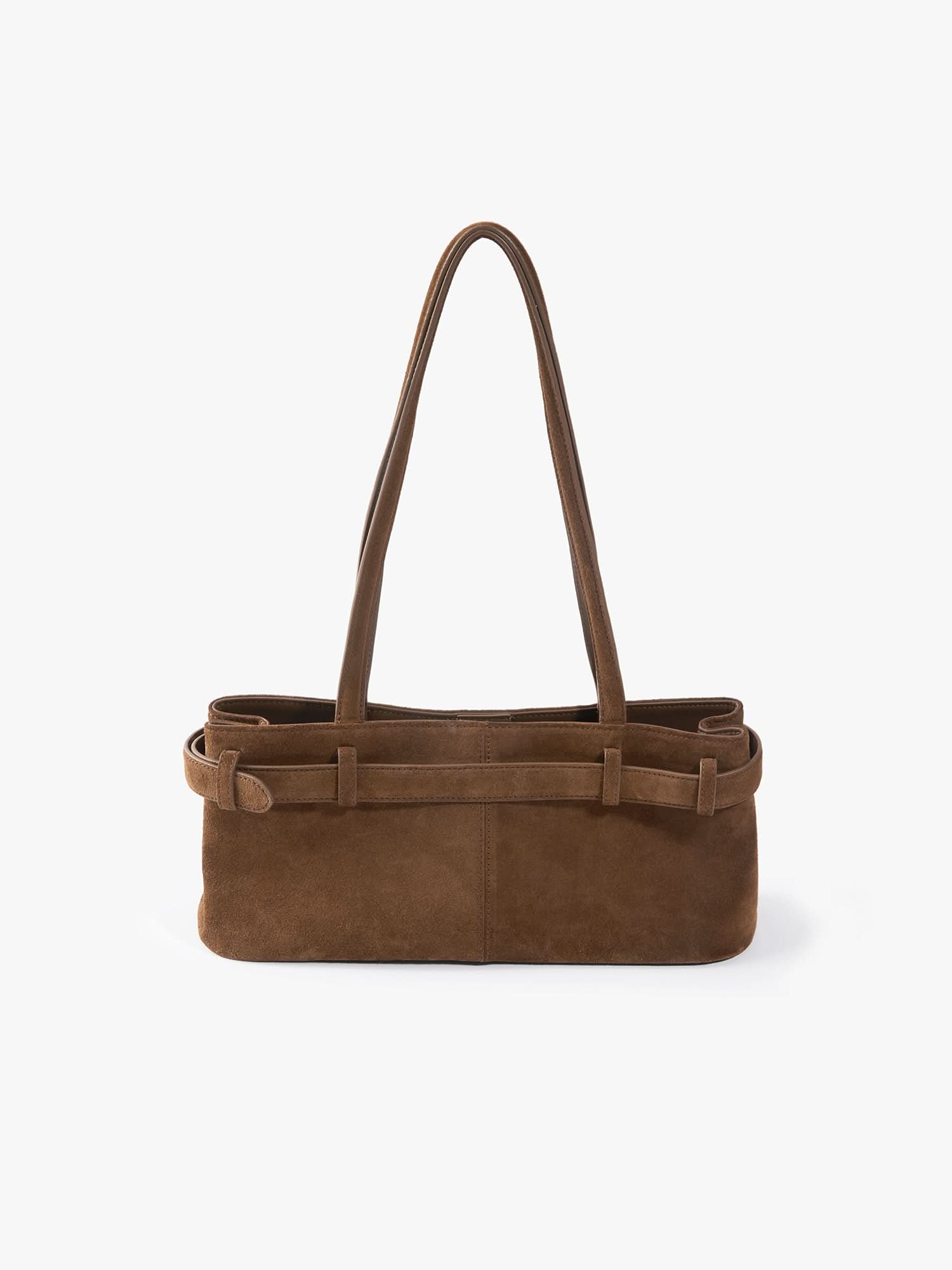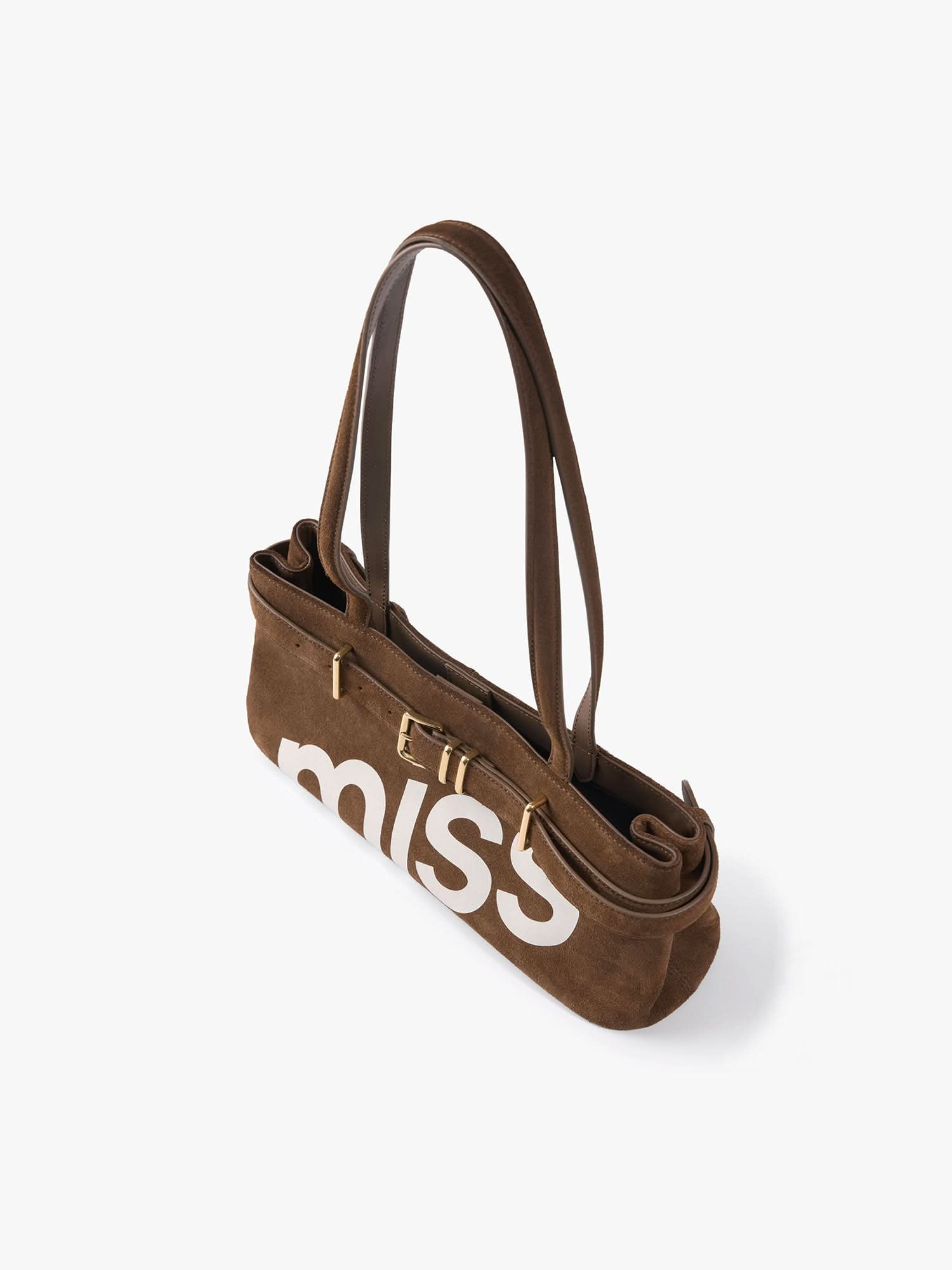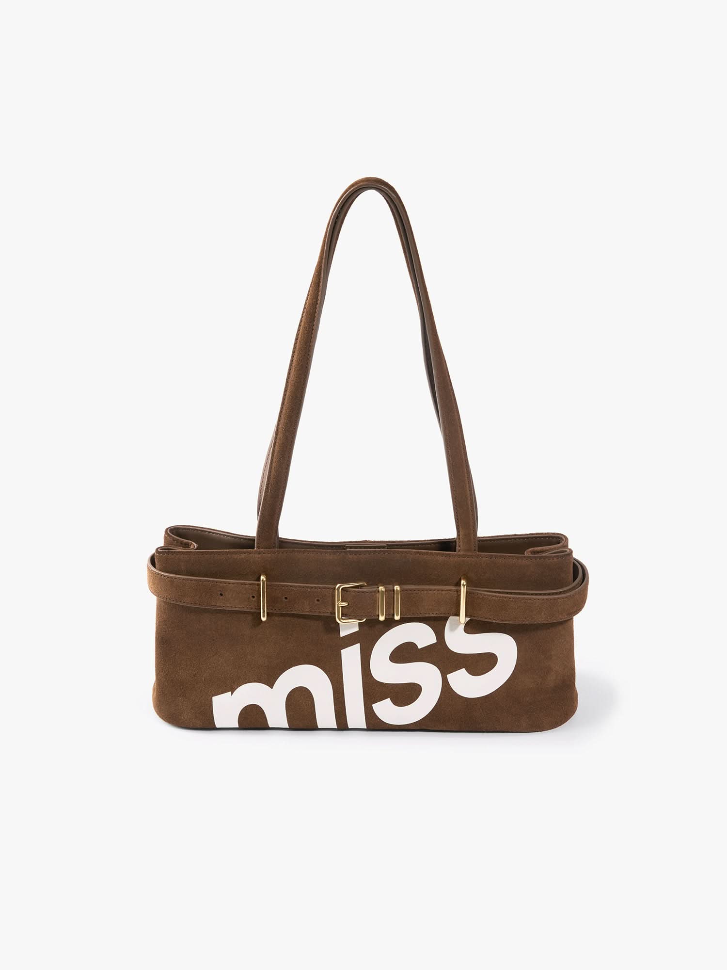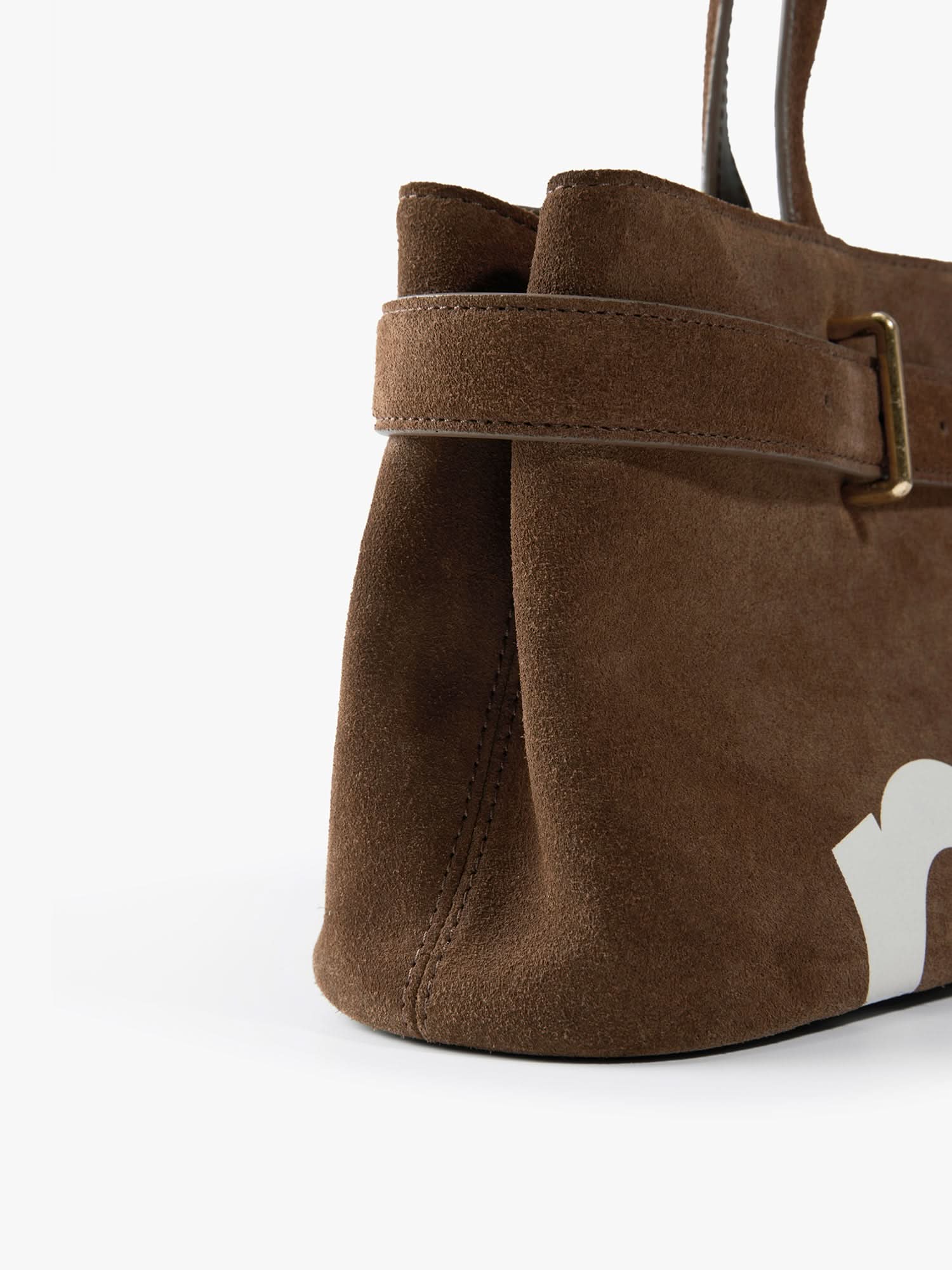 The bag features a striking color-blocked letter print design with loop strap details that create a vintage style. It can be carried by hand or worn over the shoulder. Made from suede leather material, it offers a comfortable feel with a refined and premium texture.