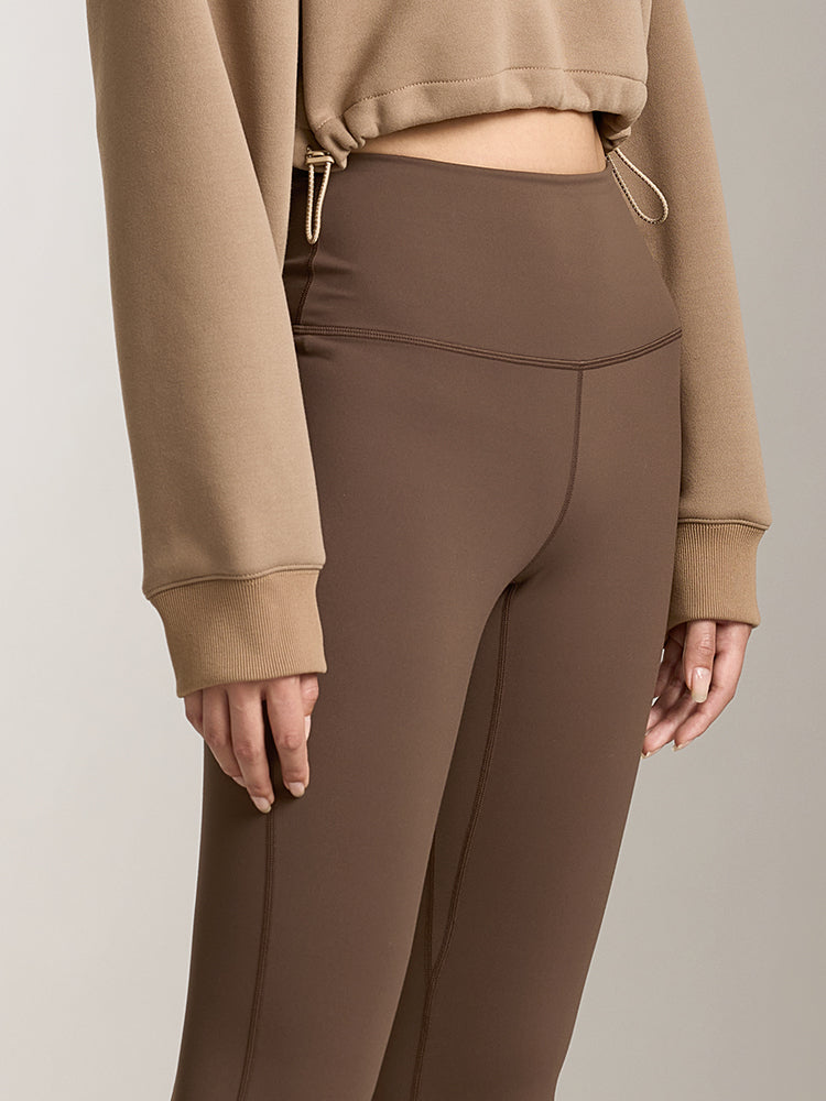 Crafted from high-quality nylon-spandex stretch fabric, this garment features a smooth and soft texture with excellent elasticity, providing a comfortable and unrestricted fit. The double-sided brushed finish feels as soft as bare skin, easily contouring to the body's curves, making it perfect for sports and casual wear. The unique wide high-waist design offers better coverage of the waist and abdomen, accentuating a graceful and elongated silhouette. The rounded seam structure at the hips enhances muscle definition, creating a visually lifted effect. The slim, tapered leg design with segmented seam structure visually narrows the legs, emphasizing a sexy, long-legged appearance.