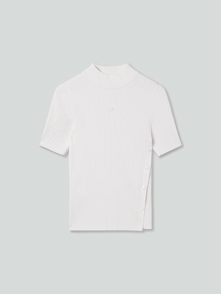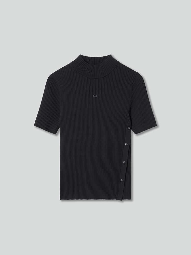 Woven from a silk blend yarn, this garment offers excellent elasticity, with the inclusion of mulberry silk providing a delicate and refreshing touch. The outer viscose fiber makes the fabric soft and comfortable against the skin, offering a lightweight and breathable feel. The elegant half-high collar enhances the neckline, easily adapting to seasonal temperature changes. The waved sleeve cuffs add a dynamic visual appeal, while the single-side button detail allows for adjustable shaping, giving the garment a more structured and fashionable silhouette.