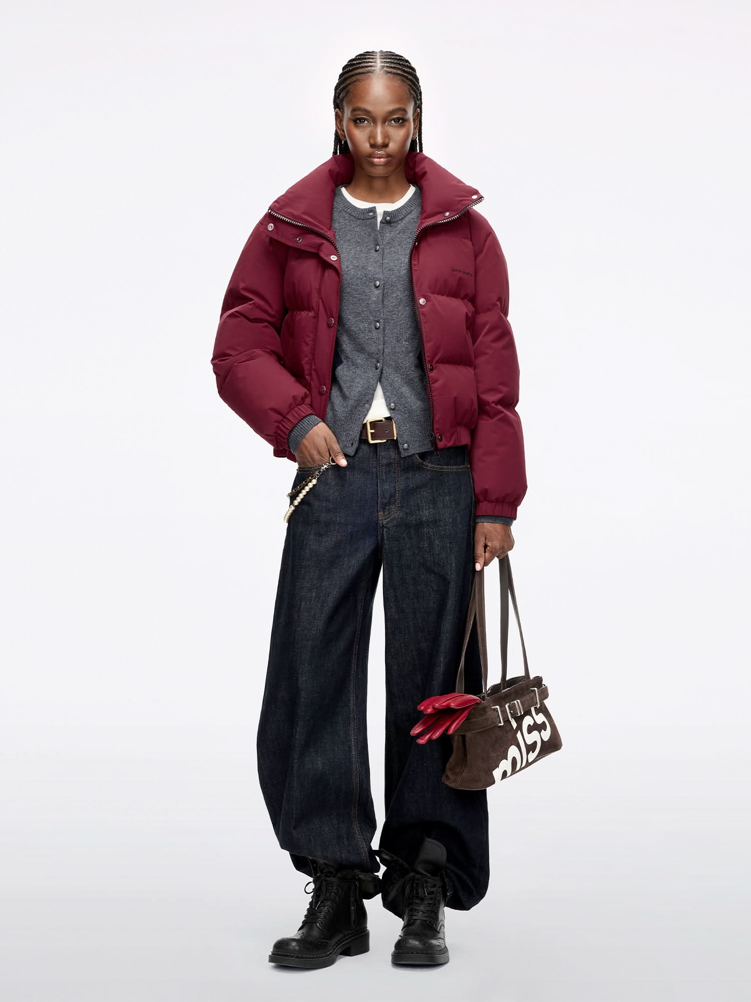 The down jacket features a double-layered front and a windproof stand-up collar, with horizontal quilting creating a full yet streamlined silhouette. Ribbed hem detailing cinches the shape for a clean, minimalist look. Made from laminated down fabric with a smooth, refined texture, it is filled with premium 90% duck down for warmth and comfortable wear.