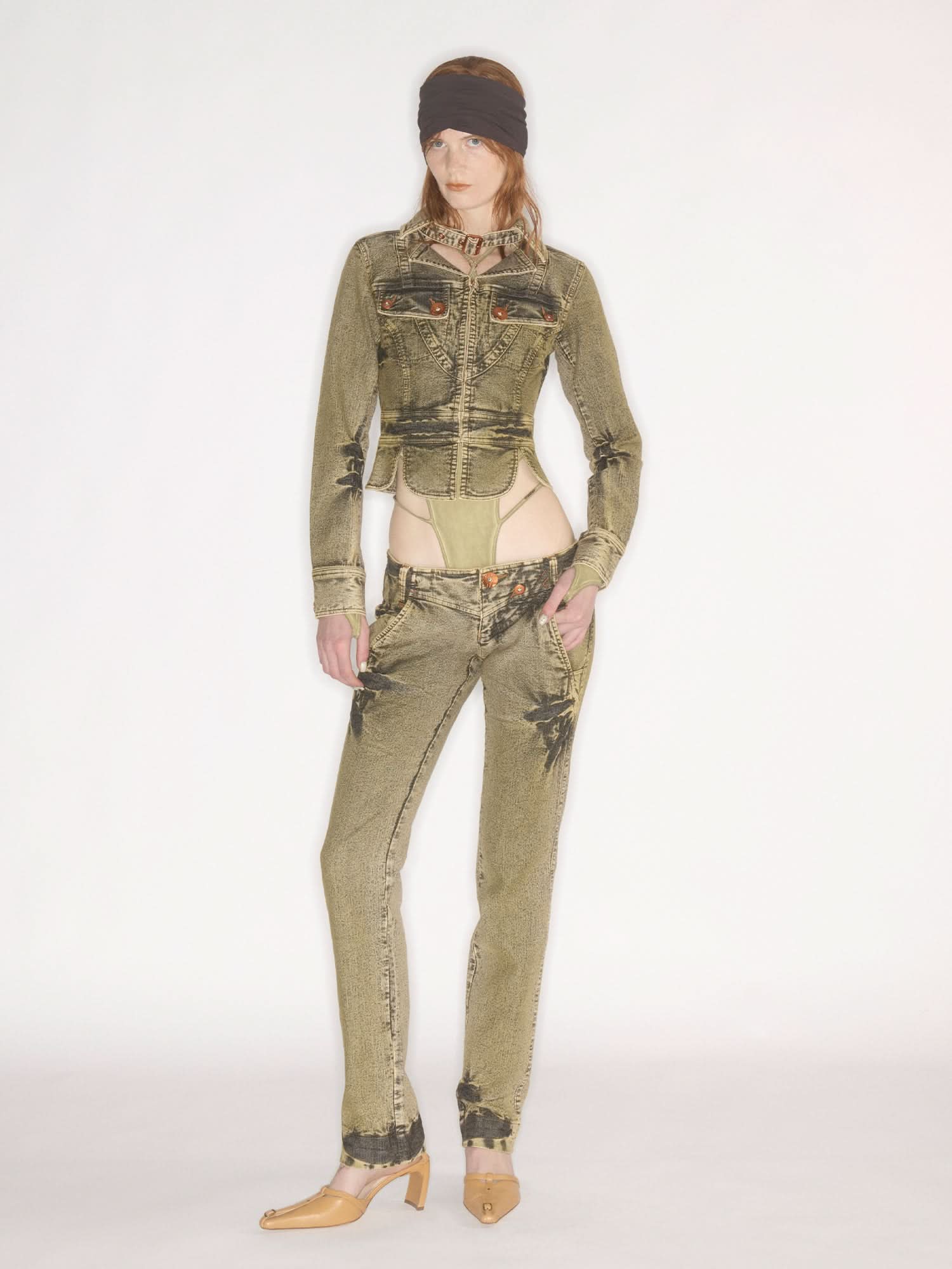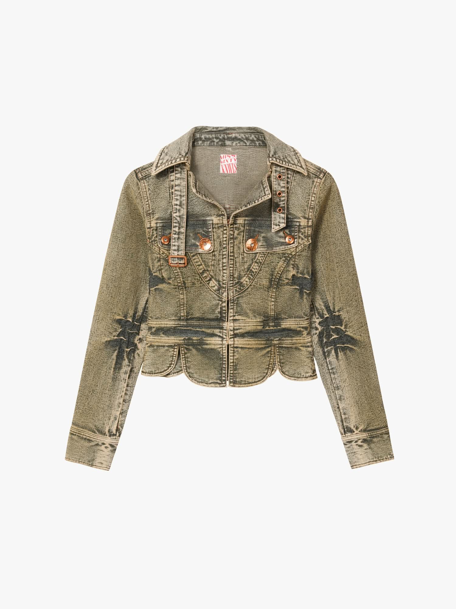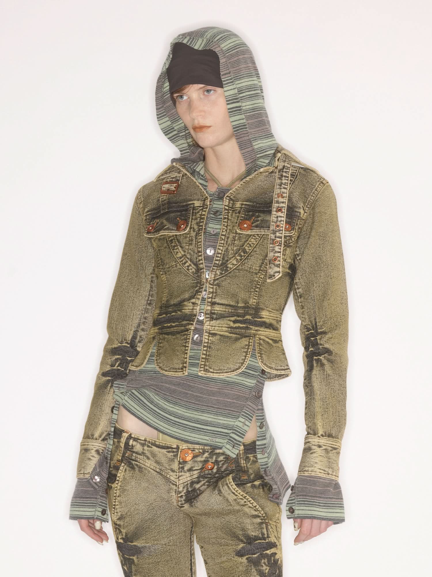 The MISS SIXTY × KNWLS collaboration features a denim jacket with a unique deconstructed cut and cropped silhouette. Specially treated fabric redefines the traditional look and texture of denim, while nostalgic washing and dyeing techniques create an irregular tie-dye effect, making each piece one-of-a-kind and embodying a futuristic aesthetic.