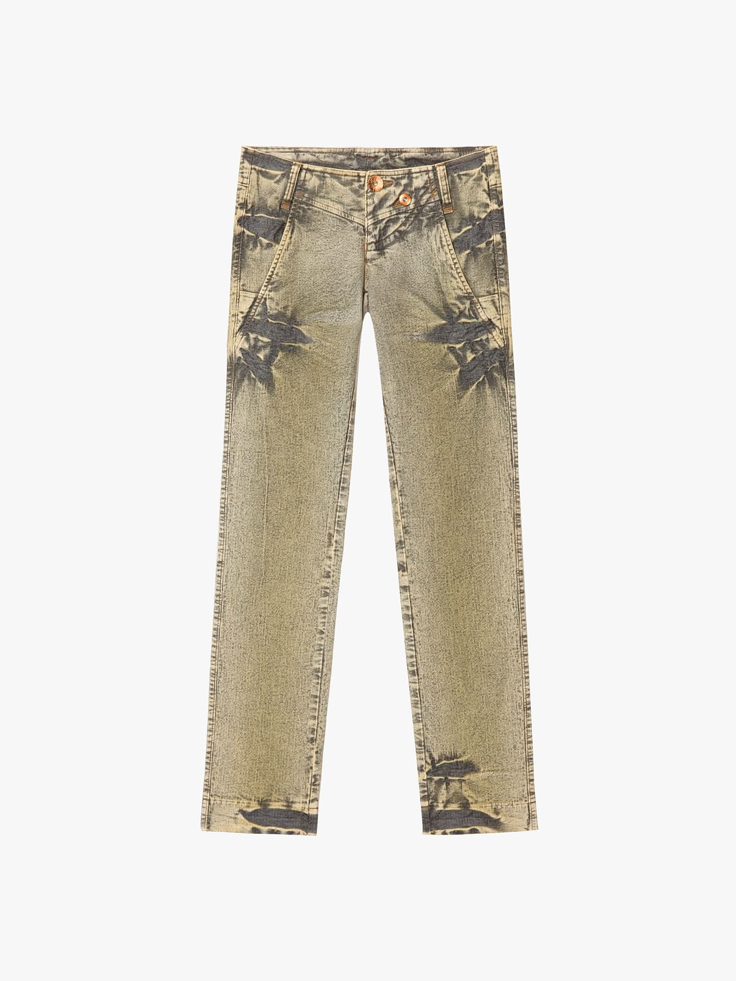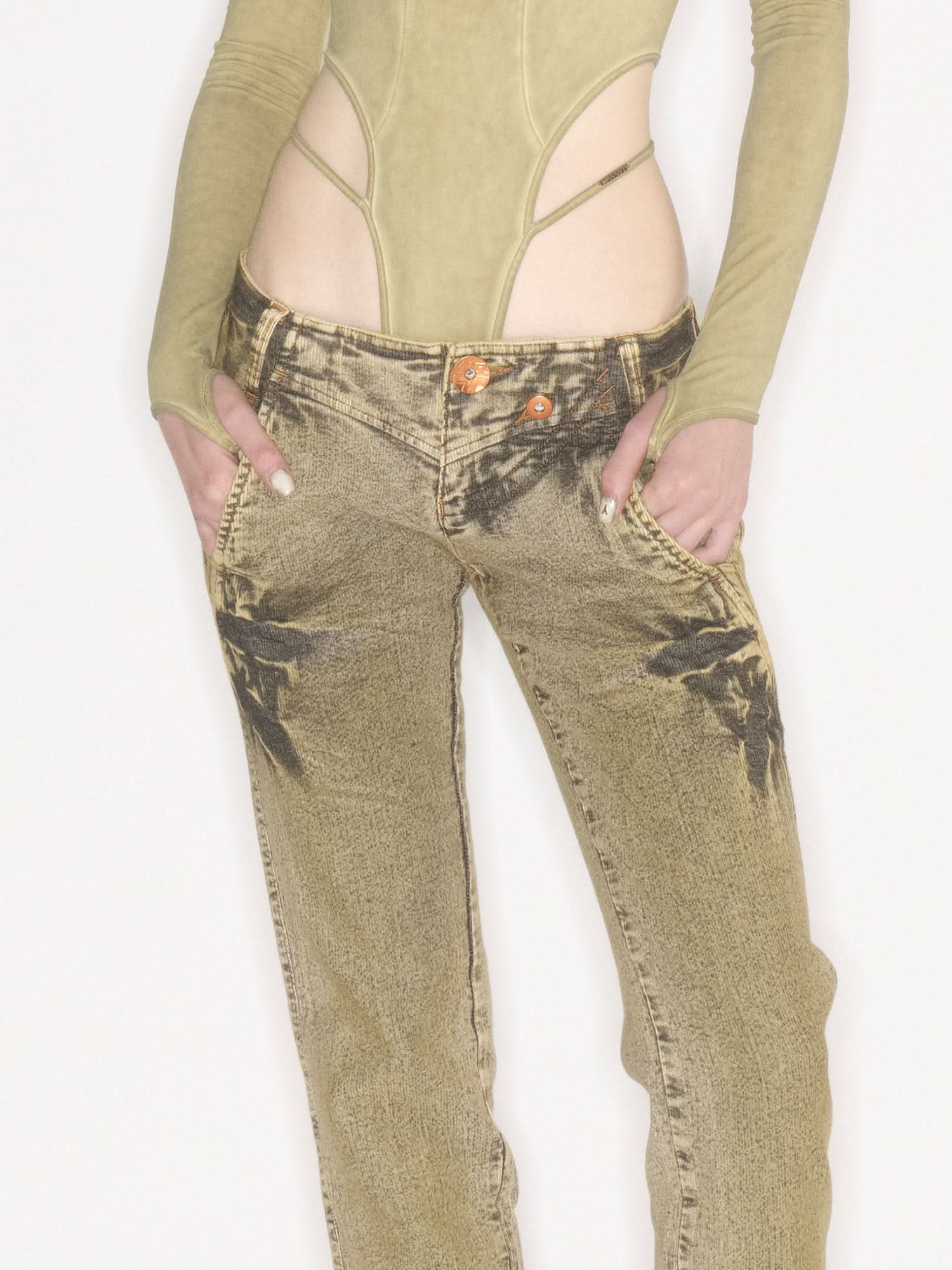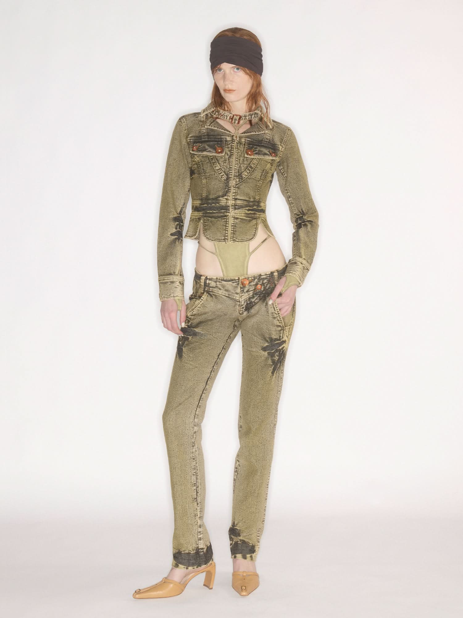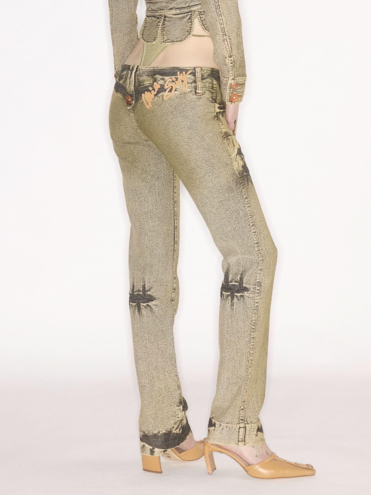 The MISS SIXTY × KNWLS collaboration features jeans with a unique deconstructed cut and low-waist silhouette, accented with leather logo patchwork details. Specially treated fabric redefines the traditional look and texture of denim, while nostalgic washing and dyeing techniques create an irregular tie-dye effect, making each piece unique and embodying a futuristic aesthetic.
